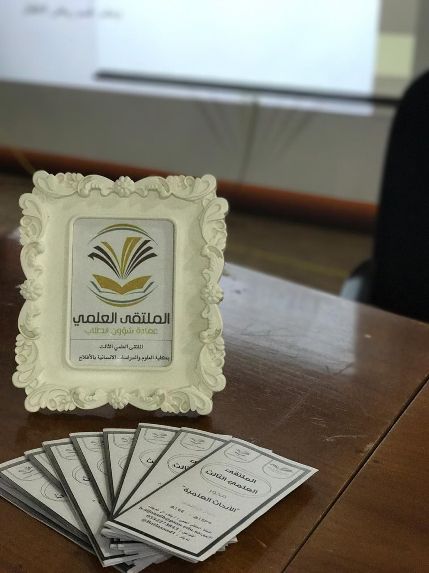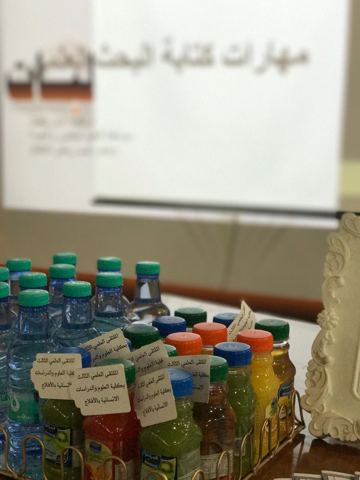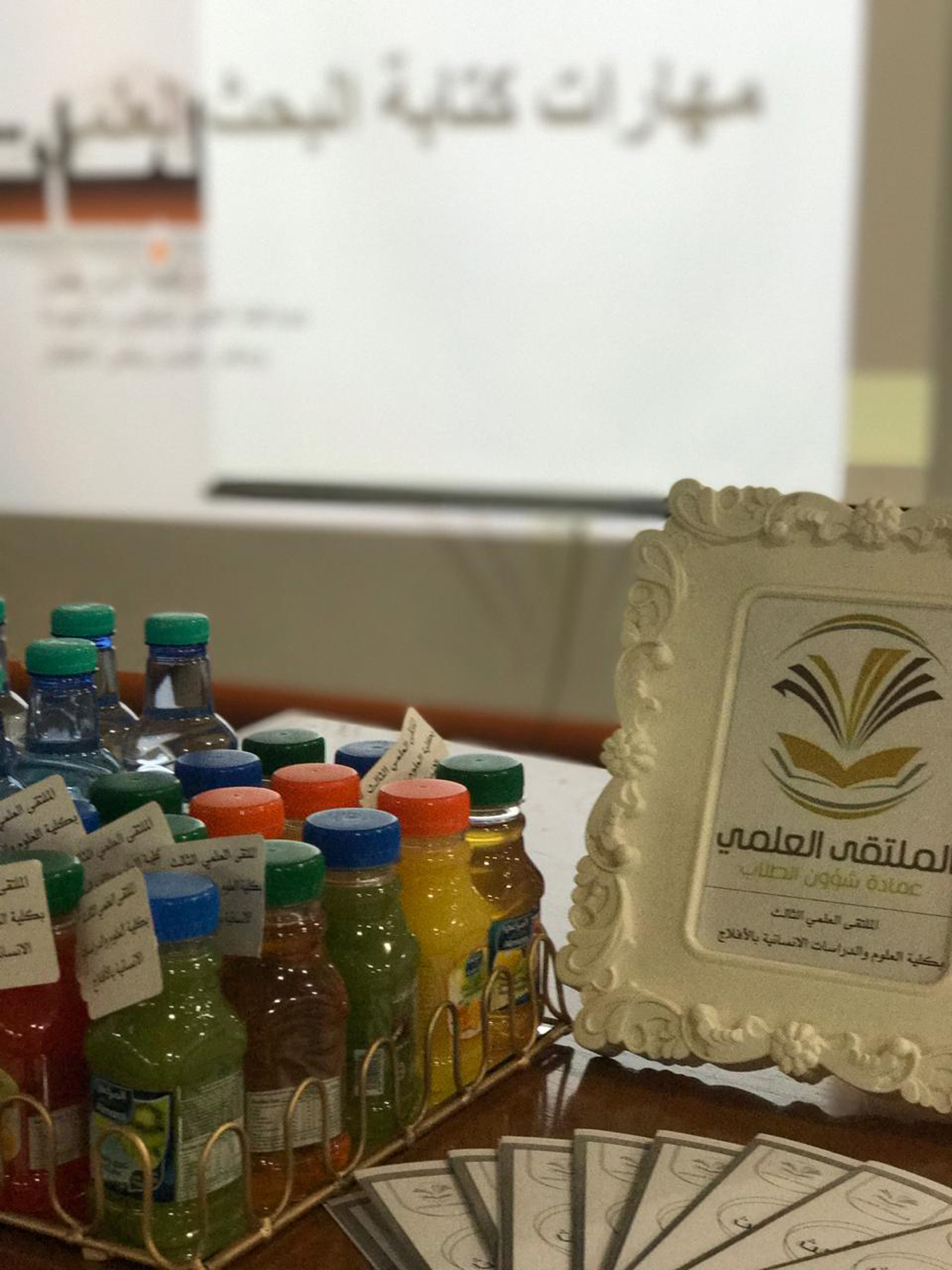 نظمت لجنة الملتقى العلمي الثالث بكلية العلوم والدراسات الإنسانية بالأفلاج ( شطر الطالبات ) يوم الثلاثاء 16/5/1440 هـ الساعة التاسعة صباحاً في مسرح الكلية , دورة تدريبية بعنوان ( مهارات كتابة البحث العلمي ) قدمتها أ.د نادية عزيز , افتتحتها بمقدمة عن الأبحاث العلمية وطرق كتابتها , وتوجيه الطالبات لكيفية استخدام المراجع فيها و خطوات كتابة البحث العلمي , كما استعرضت عدد من المواضيع وطرحها كأمثلة للأبحاث .