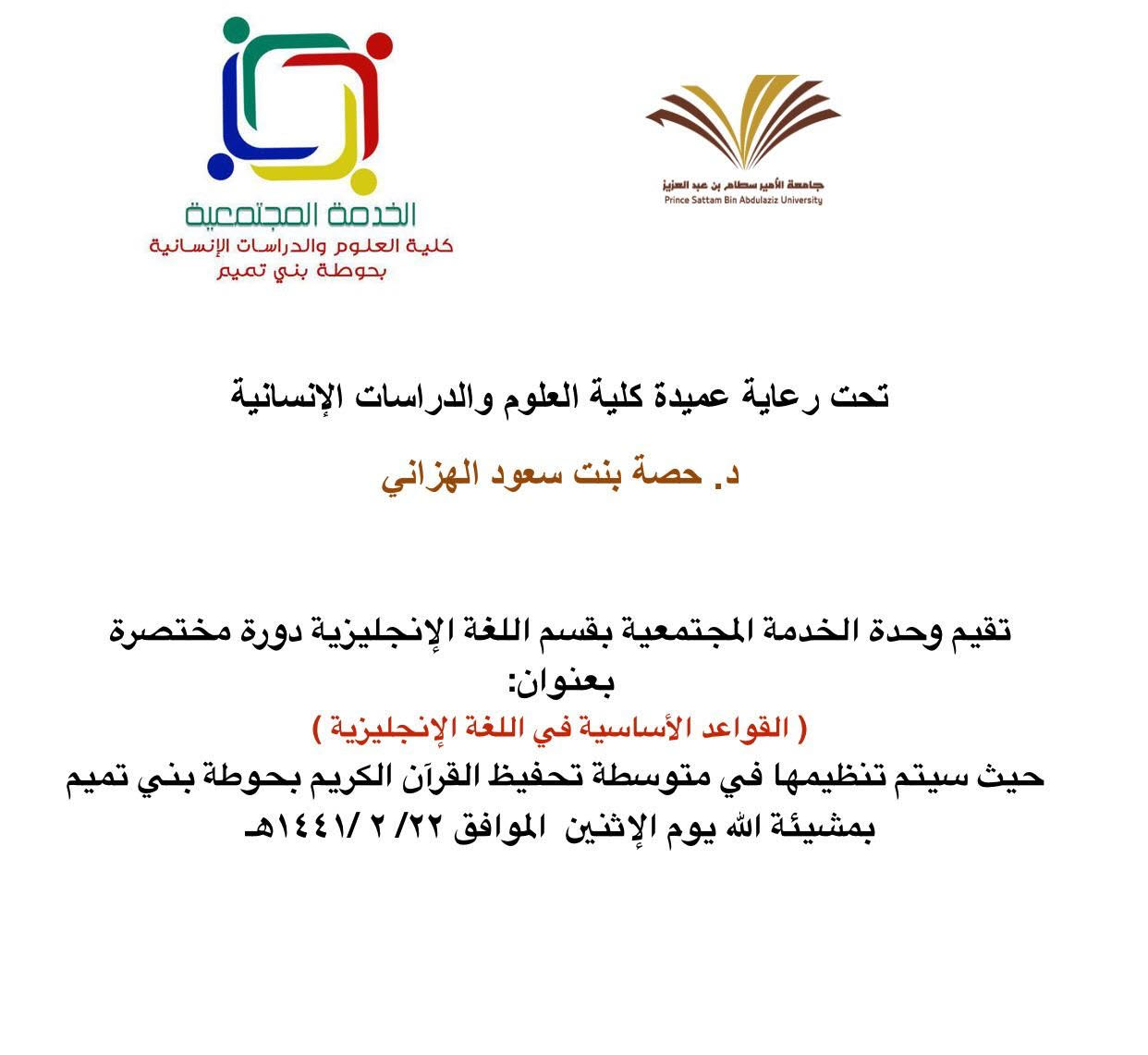 المشاركة المجتمعية عملية تعكس رغبة المجتمع واستعداده في تطوير وتحسين التعليم، وبناءً على ذلك وبتوجيه من عميدة كلية العلوم والدراسات الإنسانية د. حصة بنت سعود الهزاني، نظمت وحدة الخدمة المجتمعية بقسم اللغة الإنجليزية يوم الأثنين الموافق: ٢٢/ ٢ /١٤٤١هـ دورة مختصرة بعنوان ( القواعد الأساسية في اللغة الإنجليزية ). حيث أقيمت الدورة في مدرسة متوسطة تحفيظ القرآن الكريم بحوطة بني تميم، و تضمنت مراجعة ملخصة لأهم قواعد اللغة الإنجليزية ومهاراتها ومتطلبات تطويرها مع طالبات المرحلة المتوسطة مما ساهم في ترسيخ أهم الأساسيات المطلوبة في هذه المرحلة لإتقان مبادئ اللغة الإنجليزية.