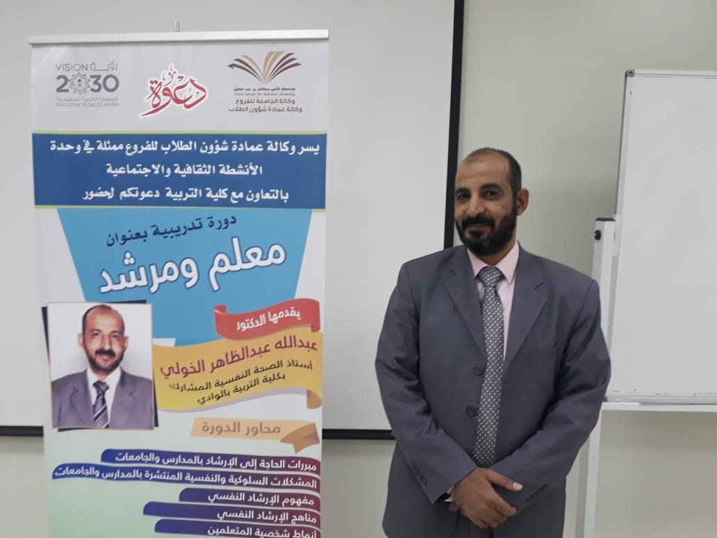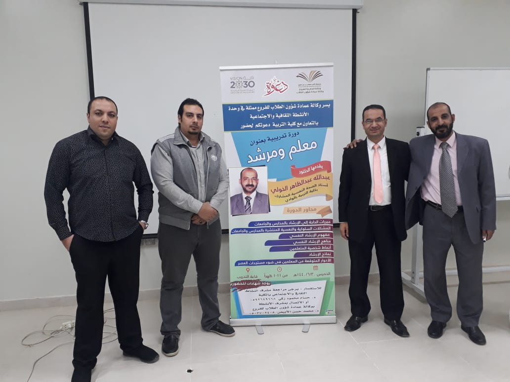 أقامت وكالة عمادة شؤون الطلاب للفروع ممثلة في وحدة الأنشطة الثقافية والاجتماعية بالتعاون مع كلية التربية بوادي الدواسر يوم الخميس الموافق 1440/6/30هـ دورة تدريبية بعنوان معلم ومرشد ، قدمها الدكتور عبدالله الخولى الأستاذ المشارك بكلية التربية بالوادي، بحضور عدد من أعضاء هيئة التدريس وطلاب كليتي الآداب والعلوم وكلية التربية .