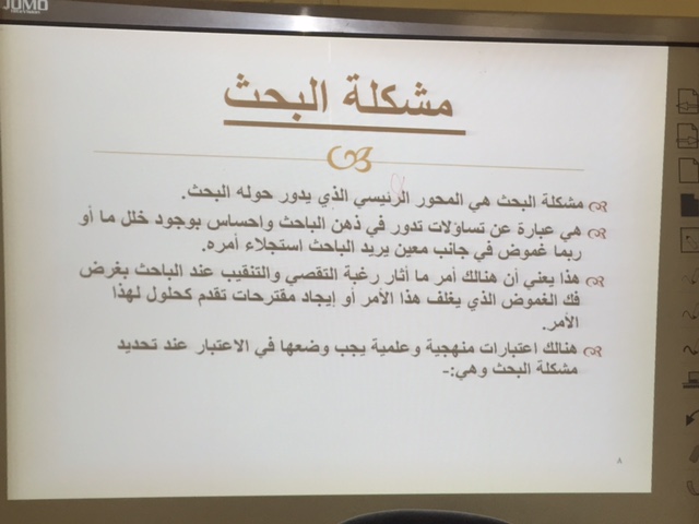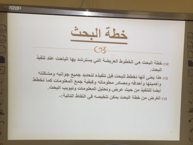 أقامت كلية العلوم والدراسات الإنسانية بالأفلاج ضمن استعداداتها للمؤتمر العلمي السابع يومي الأحد و الأثنين في تمام الساعة التاسعة صباحاً بمصلى الكلية , دورة عن ( كيفية إعداد خطة بحث علمي ) قدمتها د.مي مصطفى , تحدثت عن إعداد خطة بحثية علمية للمشاركة في المؤتمرات العلمية أو التقدم للحصول على درجة علمية , بدأت الدورة في اليوم الأول منها بعرض نظري عن الغرض من خطة البحث و أهم عناصر خطة البحث , و تكلمت بإستفاضة عن كل عنصر من هذه العناصر , واليوم الثاني للدورة قامت بالاجتماع بالطالبات ووضع بعض الأفكار لديهن و صياغتها بصورة خطة بحثية , استهدفت الدورة شريحة طالبات الكلية , هدفت إلى تدريب الطالبات على إعداد خطة بحث علمي .