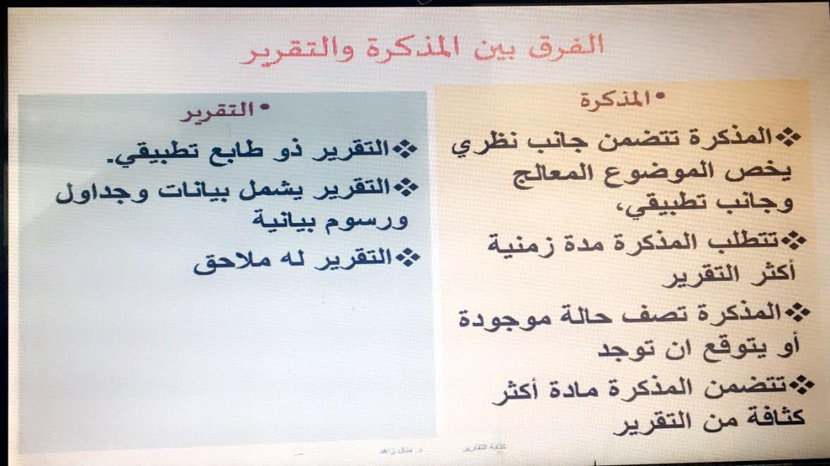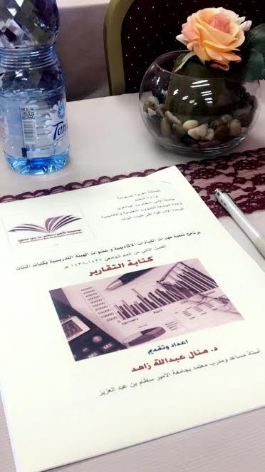 أقيمت دورة تدريبية بعنوان (كتابة التقارير )للدكتورة منال زاهد أستاذ مساعد ومدرب معتمد بجامعة سطام وذلك يوم الخميس الموافق 26-5-1438هـ حيث هدفت الدورة الى اكساب المتدربات المعلومات اللازمة لتمكينهن من إعداد التقارير وقد تضمن الدورة عدد من المحاور منها : ماهي التقارير وما أهميتها في العمل الجامعي ,وكيف تعبر التقارير عن حجم الجهد المبذول في العمل ,الفرق بين التقرير والمذكرة , مكونات التقرير ومراحل إعداده ,أخطاء في كتابة التقارير وتصميم وإخراج التقرير ,بعد ذلك وضحت الدكتورة منال الفرق بين المذكرة والتقرير وماهي أهمية التقارير و أهدافها كما وضحت ايضاً شروط إعداد التقرير الجيد وأنواع التقارير .