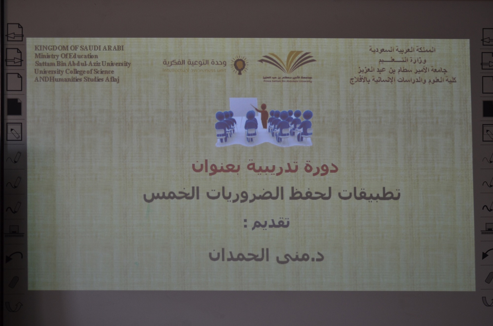 نظمت وحدة التوعية الفكرية بكلية العلوم والدراسات الإنسانية بالأفلاج يوم الثلاثاء الموافق1440/2/22 هـ عند الساعة العاشرة صباحاً في قاعة التدريب دورة تدريبية بعنوان (تطبيقات لحفظ الضروريات الخمس) ضمن مشروع نحو جامعة واعية ٣.
