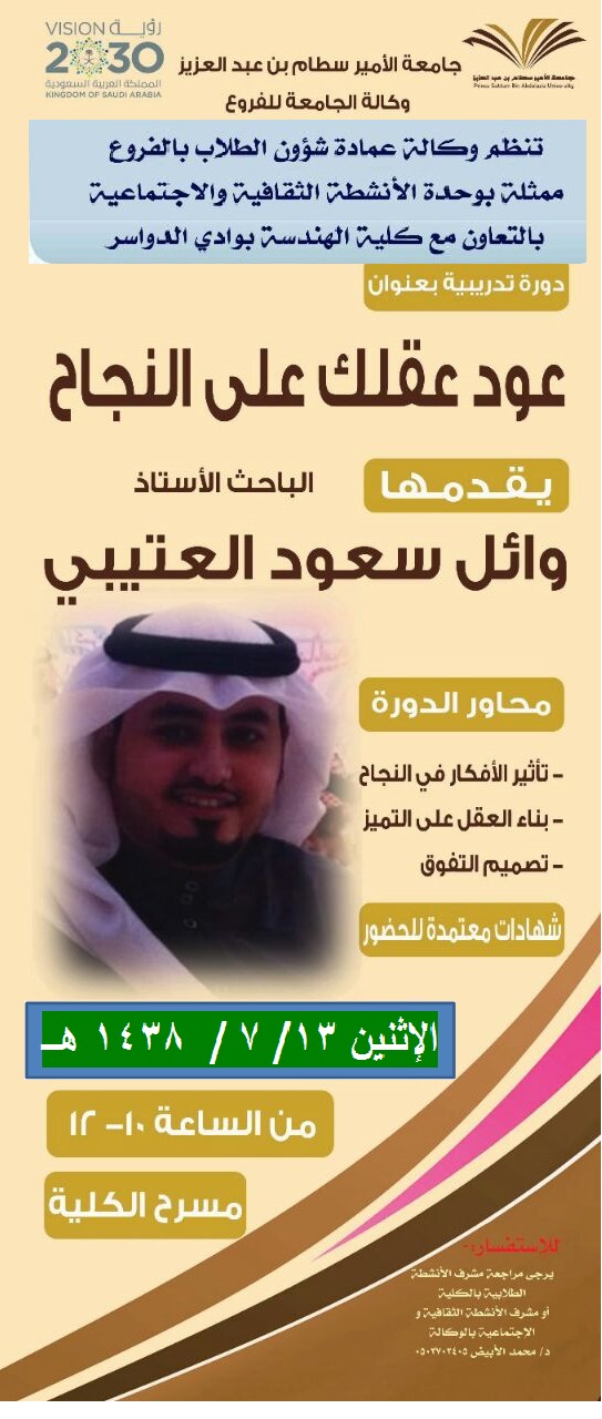 نظمت وكالة عمادة شؤون الطلاب بالفروع ممثلة بوحدة الأنشطة الثقافية والاجتماعية بالتعاون مع كلية الهندسة بوادي الدواسر دورة تدريبية بعنوان "عود عقلك على النجاح " قدمها الباحث الأستاذ/ وائل سعود العتيبي في مسرح كلية الهندسة