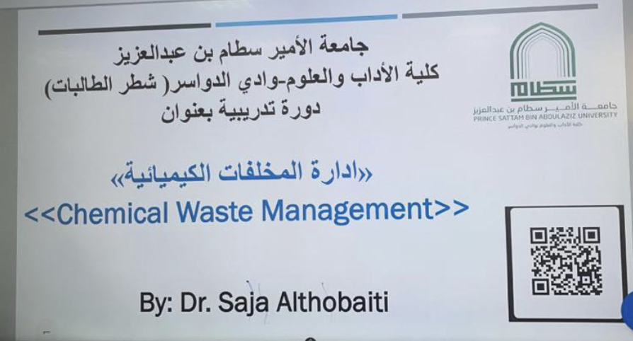 نظمت وحدة العمل الطلابي مُمثلة في لجنة الأنشطة الاجتماعية والثقافية وبالتعاون مع قسم الكيمياء بكلية الآداب والعلوم بوادي الدواسر شطر الطالبات يوم الأحد الموافق 2023/10/15م دورة تدريبية بعنوان: إدارة المُخلفات الكيميائية