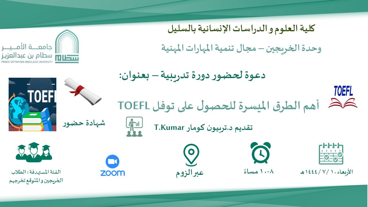 أقامت وحدة الخريجين (مجال تنمية المهارات المهنية) بكلية العلوم والدراسات الإنسانية بالسليل دورة عن بعد بعنوان: أهم الطرق الميسرة في الحصول على التوفل وذلك مساء يوم الأربعاء بتاريخ 10/ 7 / 1444 ه الموافق 1/ 2 /2023م وكانت موجهه للطلاب الخريجين والمتوقع تخرجهم بالكلية. قدم الدورة الدكتور تربيون كومار الأستاذ المساعد بقسم اللغة الإنجليزية.