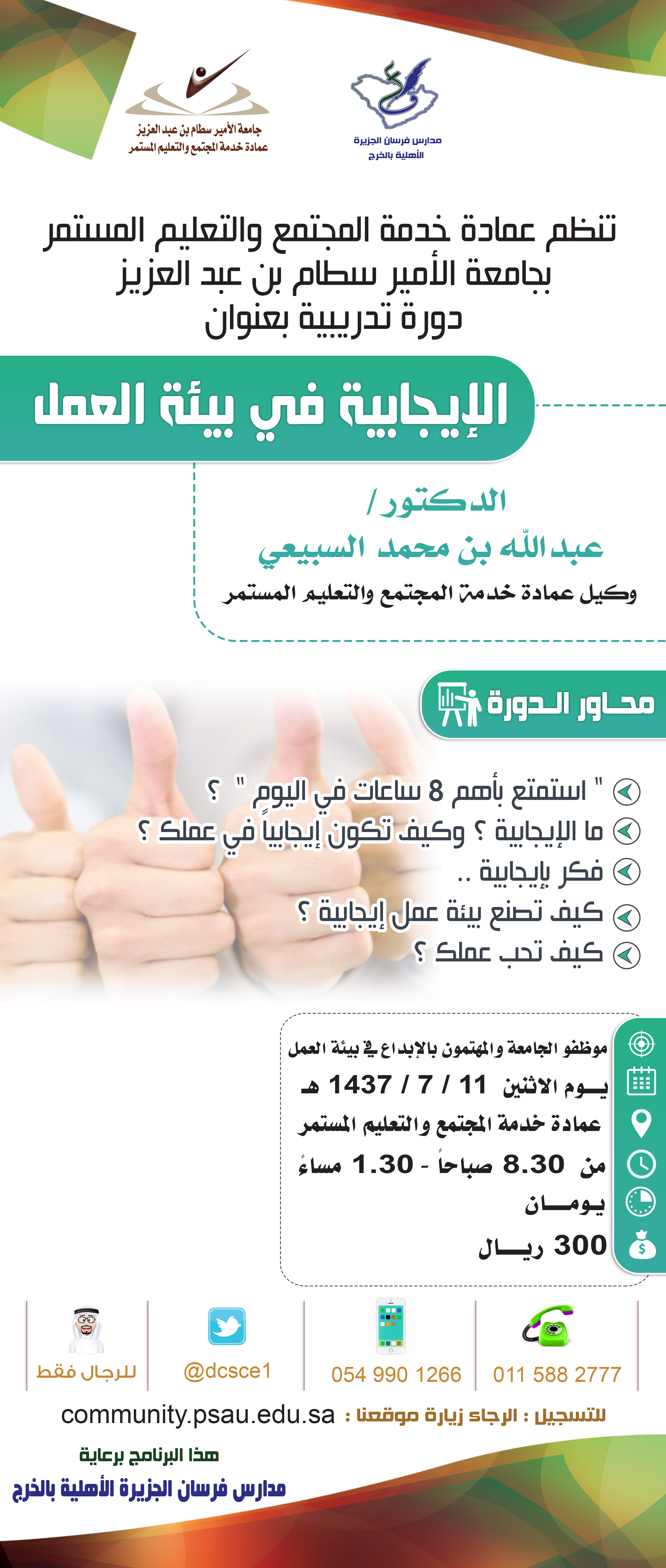عن فتح باب التسجيل في البرنامج التدريبي : الإيجابية في بيئة العمل , الذي ينطلق يوم الاثنين الموافق 1437/7/11هـ في الفترة الصباحية ابتداء من الساعة 8.30 ص إلى 1.30 م ويمتد حتى يوم الثلاثاء1437/7/12هـ .