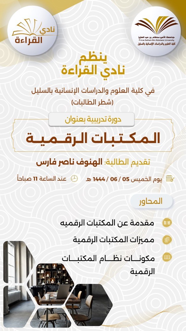 أاقام نادي القراءة في كلية العلوم والدراسات الإنسانية بالسليل ، دورة تدريبية بعنوان "المكتبات الرقمية"، وذلك يوم الخميس بتاريخ 5/6/1444هـ الموافق 29/12/2022م. وقد حضر الدورة عدداً من منسوبات و طالبات الكلية ، وقد قدمتها الطالبة / الهنوف ناصر فارس.