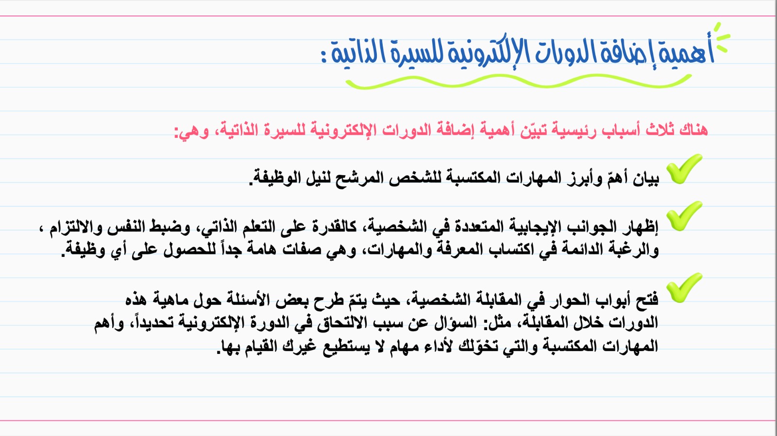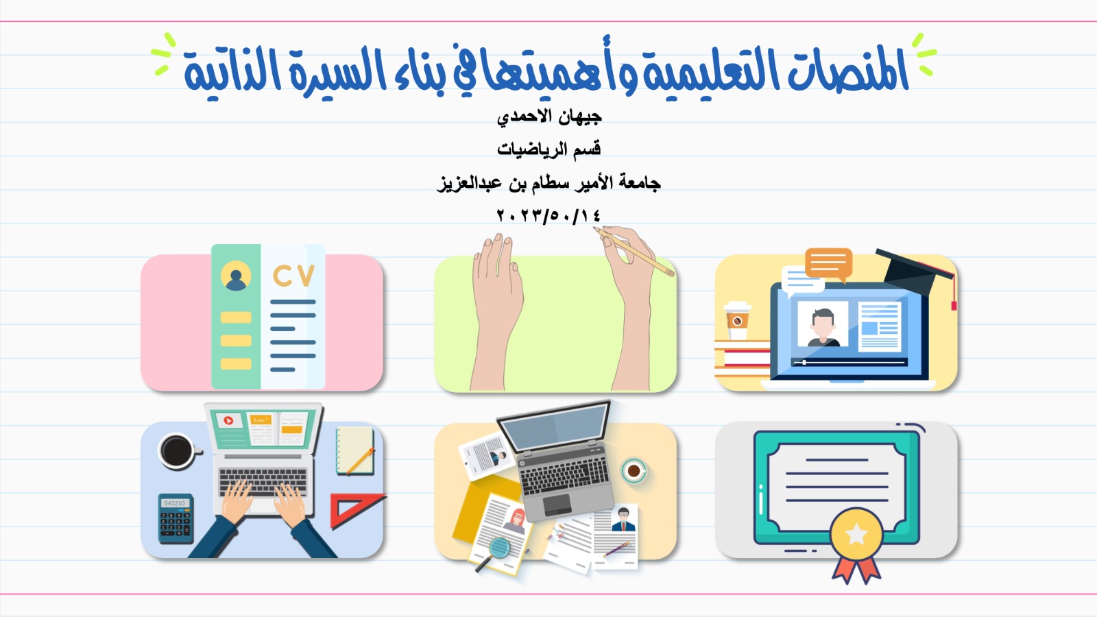 وقد هدفت الدورة الى التعريف بالمنصات التعليمية والخدمات التي توفرها من دورات و ورش عمل متعلقة بمجال التخصص والمجالات المرتبطة به أو المهارات والحرف التي لا تتعلق بمجال التخصص ، إضافة إلى التعريف بمدى أهمية إضافة شهادات هذه الدورات إلى السيرة الذاتية.