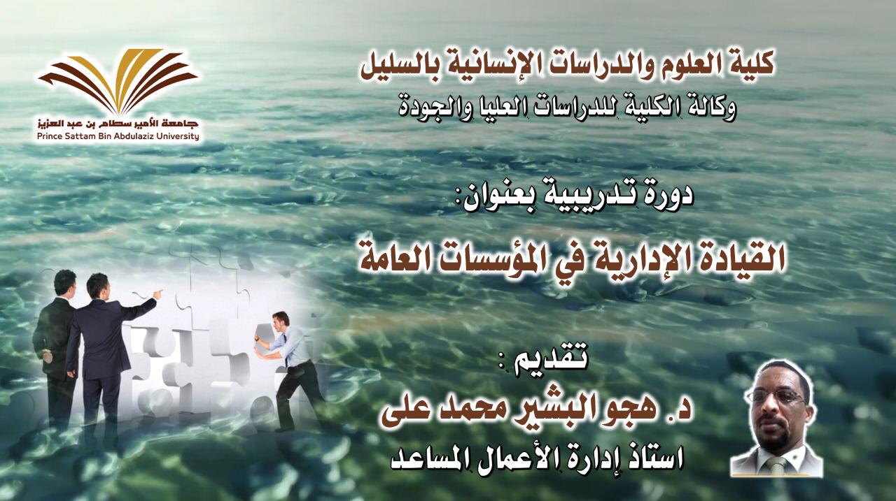 سعياً منها في تحقيق الهدف الاستراتيجي المتمثل في خدمة المجتمع و مؤسساته أقامت وحدة خدمة المجتمع بكلية العلوم والدراسات الإنسانية بالسليل دورة تدريبية بعنوان (القيادة الإدارية في المؤسسات العامة) يوم الأربعاء الموافق 25\3\1442 هـ من خلال برنامج البلاك بورد و مستهدفة بذلك بعض القطاعات الحكومية بمحافظة السليل (الجيش ؛ الدفاع الجوي؛ الدفاع المدني ؛ الكهرباء؛ المياه و كتابة العدل ) .قدم الدورة د.هجو البشير محمد علي الاستاذ المساعد بقسم إدارة الأعمال و قد تناولت عدد من المحاور تمثلت في :