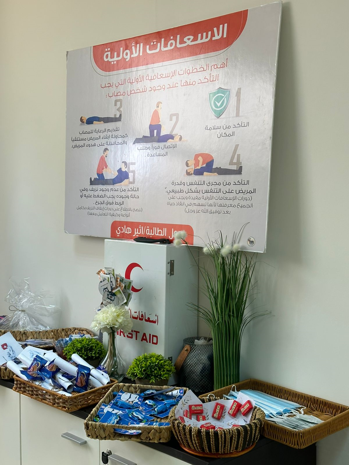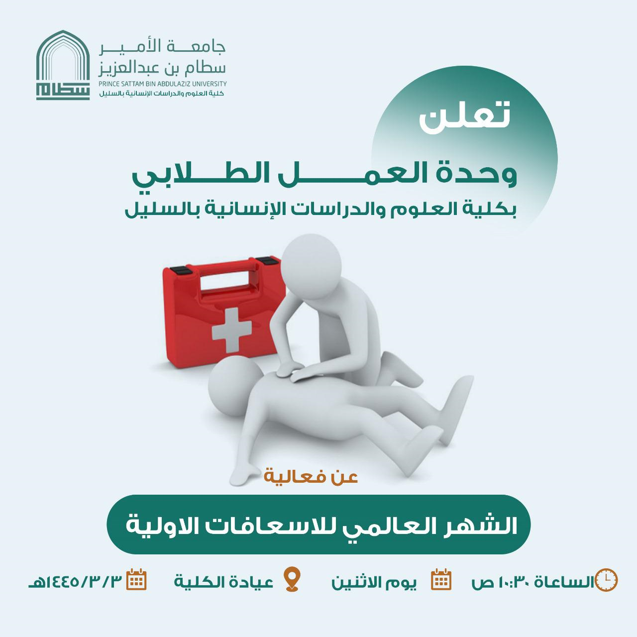 نظمت وحدة العمل الطلابي ممثلة بوحدة العمل التطوعي دورة تدريبية بعنوان " الشهر العالمي للإسعافات الاولية" ، وكان يوم الاثنين الموافق 3/3/1444هـ من الساعة العاشرة والنصف صباحاً في عيادة الكلية .