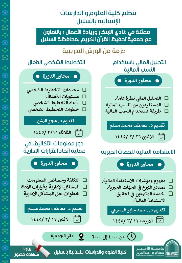 انطلقت أولى فعاليات التعاون بين نادي الابتكار وريادة الأعمال بكلية العلوم والدراسات الإنسانية بالسليل وجمعية تحفيظ القرآن الكريم بالسليل، وذلك بدورة تدريبية بعنوان ( التحليل المالي باستخدام النسب المالية) وذلك يوم الإثنين بتاريخ 26 - 2 - 1445 هـ في مقر الجمعية بالسليل ، وكانت موجهة لمنسوبي الجمعية