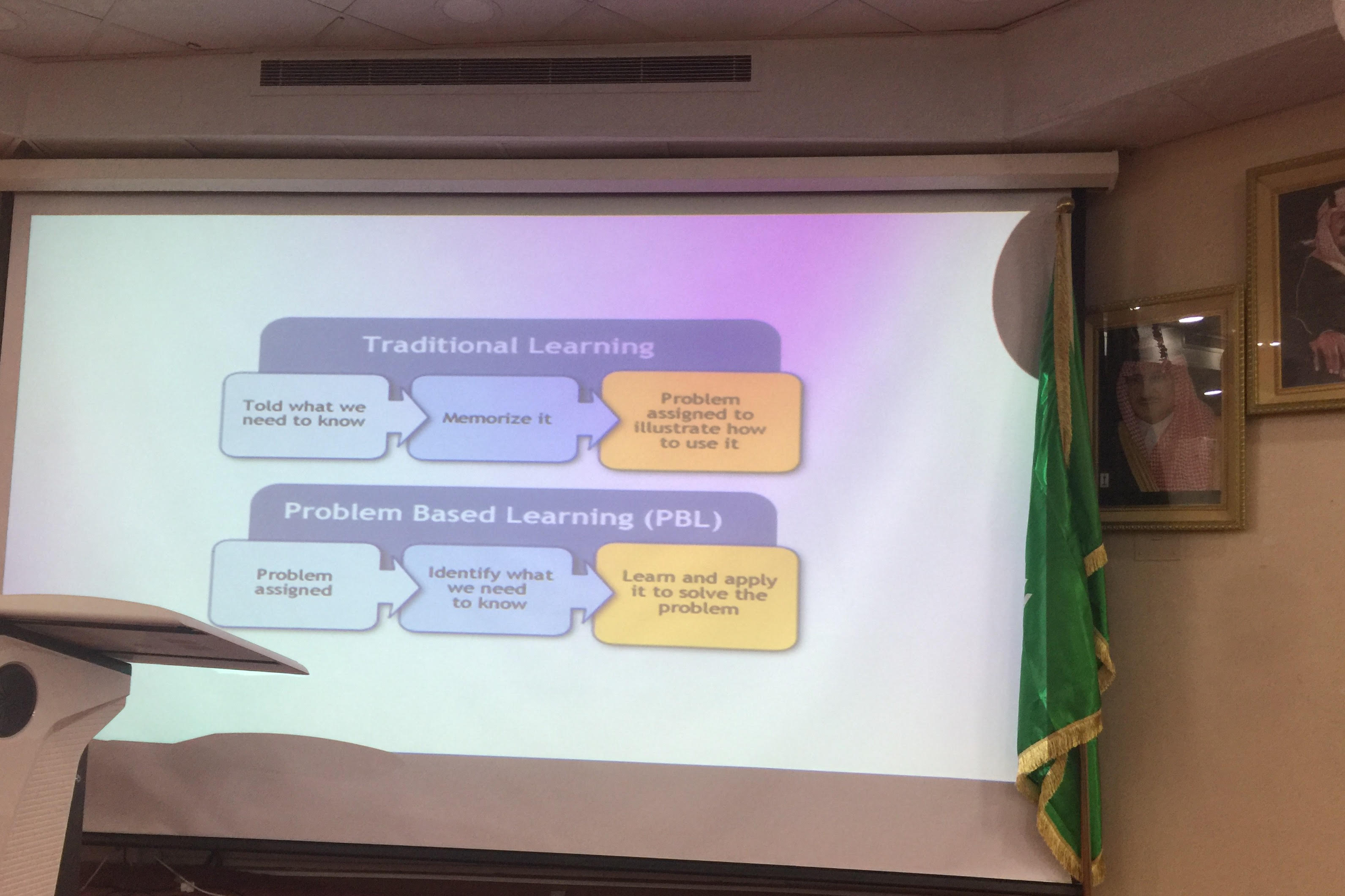 اختتمت وكالة الجامعة للشؤون التعليمية والأكاديمية ممثلة في الوحدة الإشرافية على كليات البنات الدورات التدريبية لبرنامج تنمية مهارات القيادات الأكاديمية وأعضاء هيئة التدريس للمرحلة الثانية بكلية العلوم والدراسات الإنسانية بحوطة بني تميم بدورة تدريبية بعنوان (التعلم القائم على المشكلات) تحت إشراف منسقة البرنامج بالكلية أ. الهنوف القريني وذلك يوم الثلاثاء الموافق 21 /7 /1438هـ للدكتورة نجلاء علي مصطفى أستاذ مساعد في المناهج وطرق تدريس العلوم بكلية التربية بالخرج. هدفت الدورة إلى إكساب المتدربات المعارف والمهارات والاتجاهات اللازمة للتدريس بالتعلم المبني على المشكلات والنواتج التعليمية المتوقعة هذا وقد تضمنت الدورة على محاور منها تحديد مفهوم التعلم القائم على المشكلات واستنباط المبادىء والأسس التي يقوم عليها التعلم المبني على المشكلات كأحد استراتيجيات التعلم وتحديد مكونات استراتيجية التدريس القائم على المشكلات، والتمييز بين مراحل وخطوات تنفييذ التعلم المبني على المشكلات وتحديد أهم المهارات اللازمة للتخطيط للتدريس بالتعلم القائم على المشكلات، وكذلك التمييز بين دور كل من المعلم والطالب في استراتيجية التعلم القائم على المشكلات واستراتيجيات التعلم التقليد، وتبني وتطبيق استراتيجية التعلم المبني على المشكلات كأحد الاستراتيجيات الهامة لتطبيق نموذج التعلم، وتصميم مشكلة أو سيناريو لتحقيق أهداف ومخرجات التعلم للمقررات الدراسية وتصميم مصفوفة للمشكلات التعليمية الملائمة لمقرره الدراسي وتحديد استراتيجيات التقييم الملائمة للتدريس بالتعلم القائم على المشكلات.