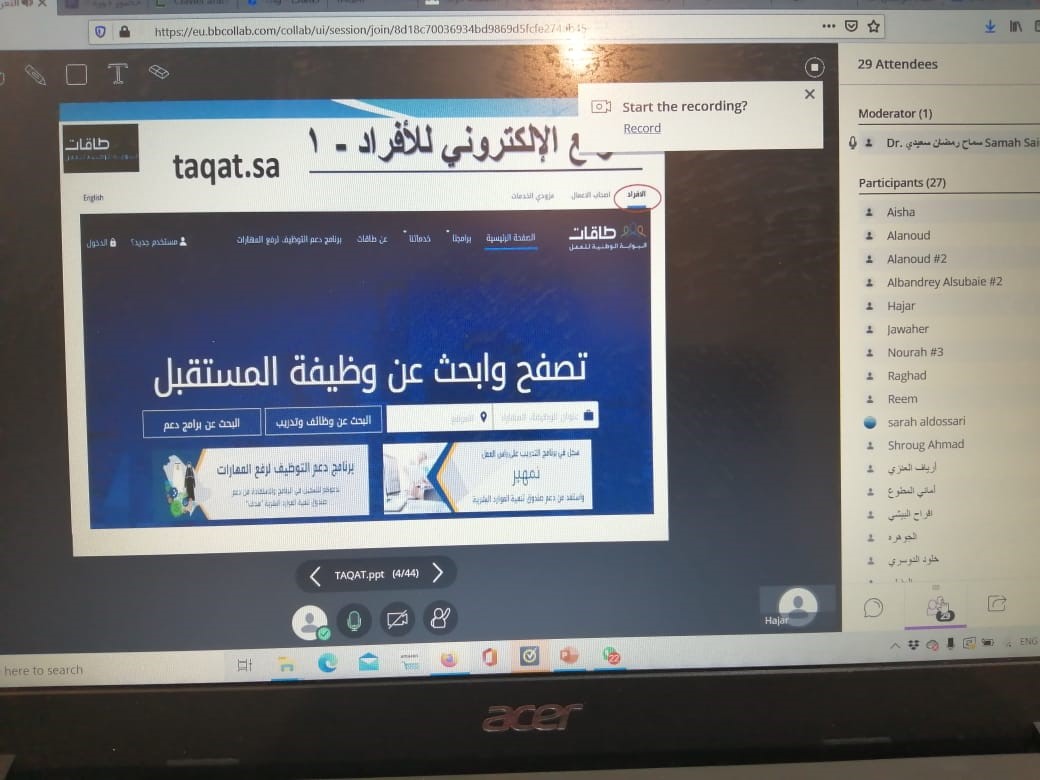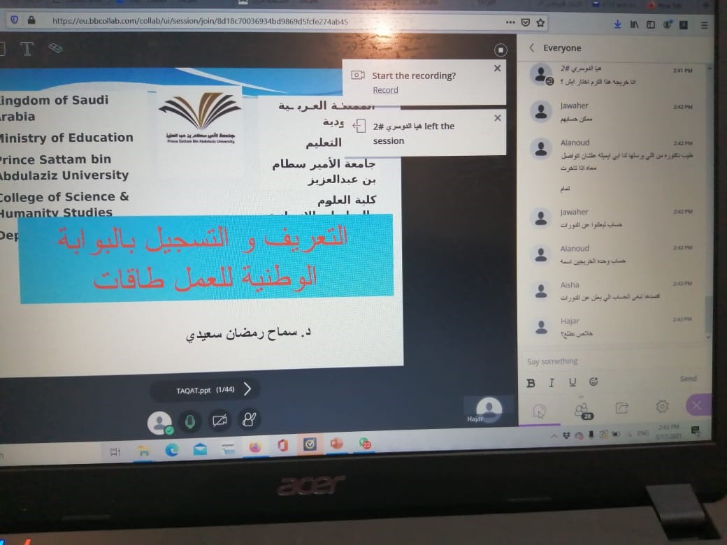 أقامت وحدة الخريجات بكلية العلوم والدراسات الإنسانية بالخرج (أقسام الطالبات) ممثلة في لجنة التأهيل الوظيفي دورة تدريبية عن بعد تحت عنوان "التعريف والتسجيل بالبوابة الوطنية للعمل طاقات" وذلك يوم الأربعاء 5\8\1442 هـ في تمام الساعة الثانية مساءًا وكانت من تقديم الدكتورة سماح رمضان سعيدي من قسم الفيزياء.