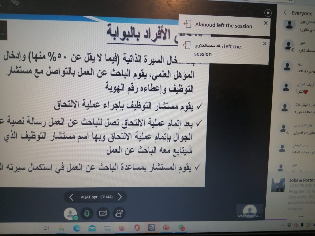 وقد تم من خلال الدورة التعريف بالبوابة الوطنية للعمل طاقات كما تم التطرق إلى أهم البرامج والدورات التدريبية التي تقدمها البوابة مثل برنامج تمهير حيث تم تسليط الضوء على شروط ومزايا الانتفاع بهاذا البرنامج.