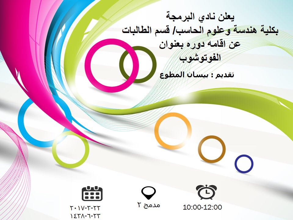 أقام نادي البرمجة بكلية هندسة وعلوم الحاسب دورة بعنوان أساسيات الفوتوشوب ، وذلك يوم الأربعاء الموافق ٢٣-٦-١٤٣٨ حيث هدفت هذه الورشة إلى تعريف الطالبات بالفوتوشوب وهو برنامج تصميم من برامج شركة أدوبي خاص بعملية معالجة وتحرير الصور والرسومات عالية الجودة وتصميم الإعلانات سواء تصميم طباعي مثل الكرت الشخصي والبروشور ، أو التصميم رقمي مثل الصور الفوتوجرافية وتحرير الفيديو ، حيث تم التعرف على فوائده وتطبيقاتة وكيفية استخدامه ، كما وتم توزيع كتيب على الطالبات يوضح طريقة استخدام برنامج الفوتوشوب .. وقد قامت بتقديم الورشة الطالبة : بيسان المطوع