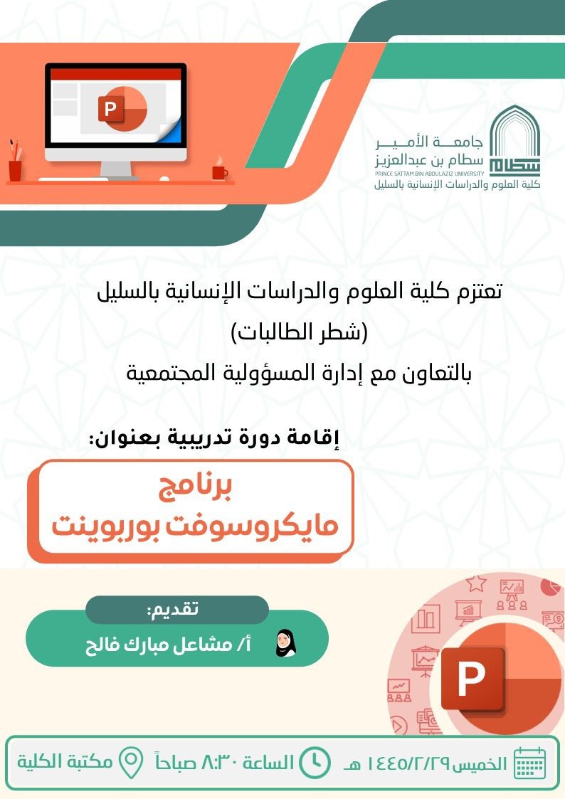 في الختام تتقدم كلية العلوم والدراسات الإنسانية بالسليل بجزيل الشكر والعرفان من الأستاذة / مشاعل مبارك الفالح، على تقديم الدورة التدريبية، وتعليم الطالبات على أهم المحاور المهمة في برنامج مايكروسوفت بوربوينت، نتقدم لها بجزيل الشكر والعرفان.