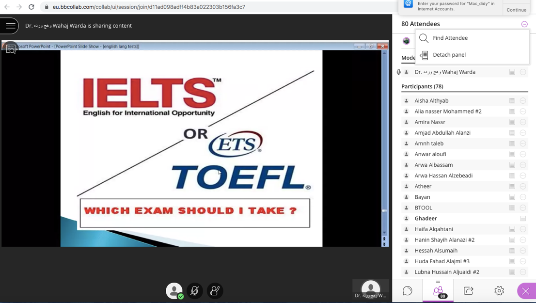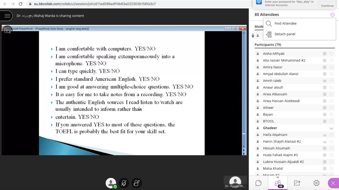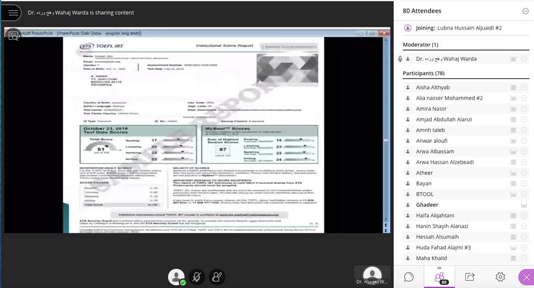 - توضيح آلية كلًا من اختبار IELTS وTOFEL مع شرح تفصيلي لجميع أجزاء الاختبارين وأنواعها وأهم المحاور الأساسية لكل اختبار وكما قامت المدربة د. وهج بتقديم عددًا كبيرًا من الأمثلة الداعمة والواضحة للطالب.