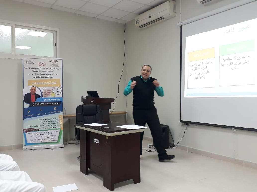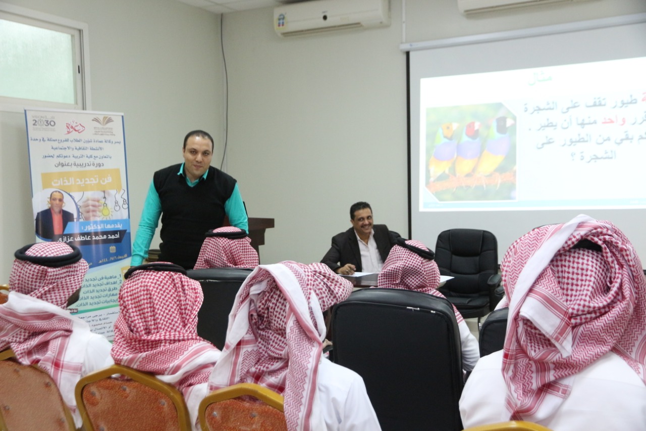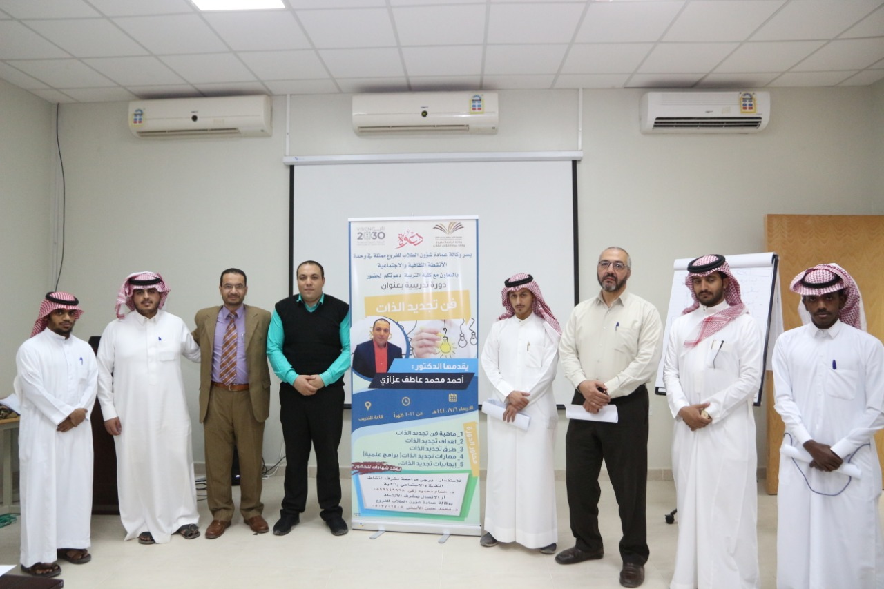 أقامت وكالة عمادة شؤون الطلاب للفروع ممثلة في وحدة الأنشطة الثقافية والاجتماعية بالتعاون مع كلية التربية بوادي الدواسر دورة تدريبية بعنوان " فن تجديد الذات" ، قدمها د. احمد محمد عزازي الأستاذ المساعد بكلية التربية بالوادي ، وبحضور عدد من أعضاء هيئة التدريس وطلاب بالكلية.