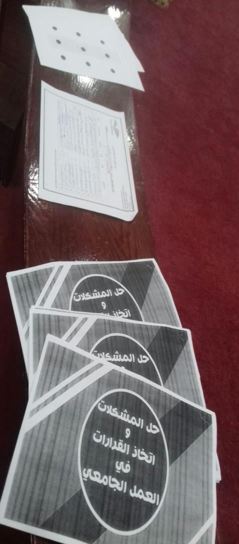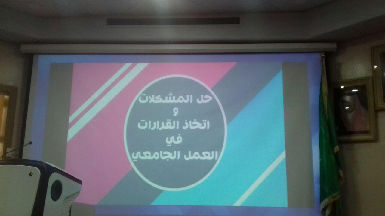 أقامت وكالة الجامعة للشؤون التعليمية والأكاديمية ممثلة في الوحدة الإشرافية على كليات البنات بكلية العلوم والدراسات الإنسانية بحوطة بني تميم دورة تدريبية بعنوان (حل المشكلات واتخاذ القرار في العمل الجامعي) وذلك يوم الأحد الموافق 29 /5 /1438هـ للدكتور محمد المهيزع عميد كلية طب الأسنان بجامعة الأمير سطام بن عبدالعزيز. وقد تضمنت الدورة المحاور الآتية: