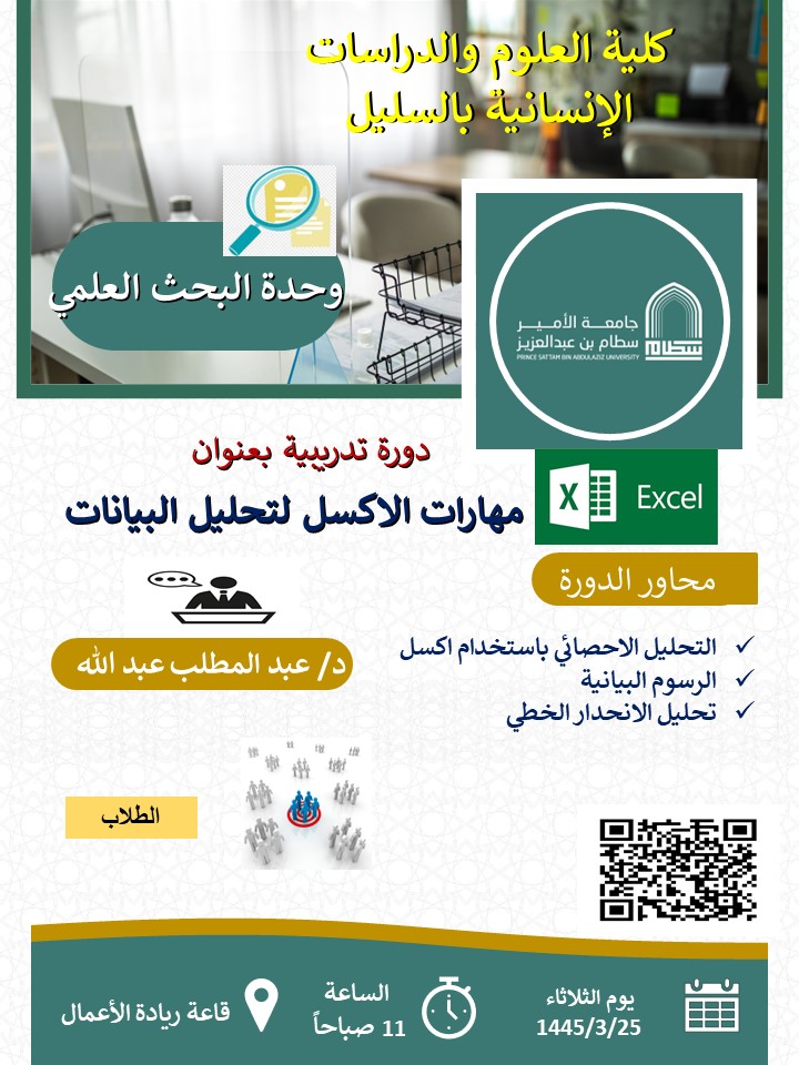 نظمت وحدة البحث العلمي في كلية العلوم والدراسات الإنسانية بالسليل دورة تدريبية تحت عنوان: (مهارات الإكسل لتحليل البيانات) قدمها الأستاذ المساعد بقسم إدارة الأعمال الدكتور عبد المطلب عبد الله الأمين، وذلك يوم الثلاثاء 25/3/1445 بقاعة ريادة الأعمال، بحضور (30) طالبا،