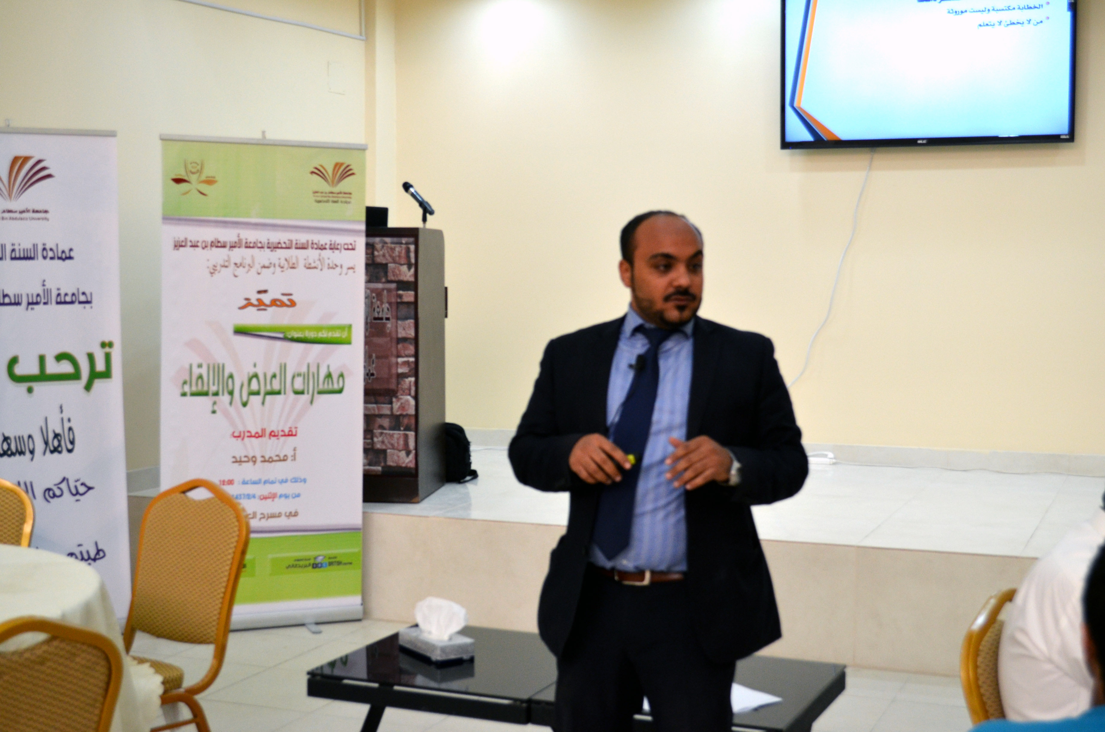 أقامت عمادة السنة التحضيرية دورة دورة تدريبية بعنوان ( مهارات العرض والإلقاء ) قدمها المدرب الأستاذ محمد وحيد حيث تطرق في البداية لأهمية امتلاك هذه المهارات، وأنها ﺟﺰﺀ ﺣﻴﻮﻱ ﻭ ﺃﺳﺎﺳﻲ ﻓﻲ ﻣﺠﺎﻝ ﺍﻟﻌﻤﻞ، والتواصل مع الآخرين.