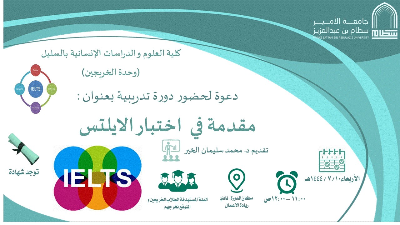 أقامت وحدة الخريجين (مجال تنمية المهارات المهنية) بكلية العلوم والدراسات الإنسانية بالسليل دورة بعنوان: مقدمة في اختبار الايلتس وذلك يوم الأربعاء بتاريخ 10/ 7 / 1444 ه الموافق 1/ 2/ 2023م وكانت موجهه للطلاب الخريجين والمتوقع تخرجهم بالكلية. قدم الدورة الدكتور محمد سليمان الخير الأستاذ المساعد بقسم اللغة الإنجليزية.
