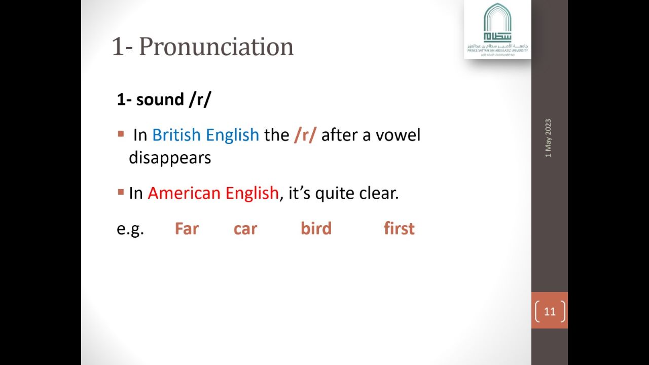وذلك يوم الإثنين 1/5/2023م الساعة 6:30 مساءً . قدمتها الدكتورة / بسنت مصطفى الأستاذة بقسم اللغة الإنجليزية ، حيث هدفت الدورة إلى تعريف المتدربات القدرة على التمييزبين الأمريكية والبريطانية فيما يتعلق بالنطق والكتابة والقواعد والمفردات .