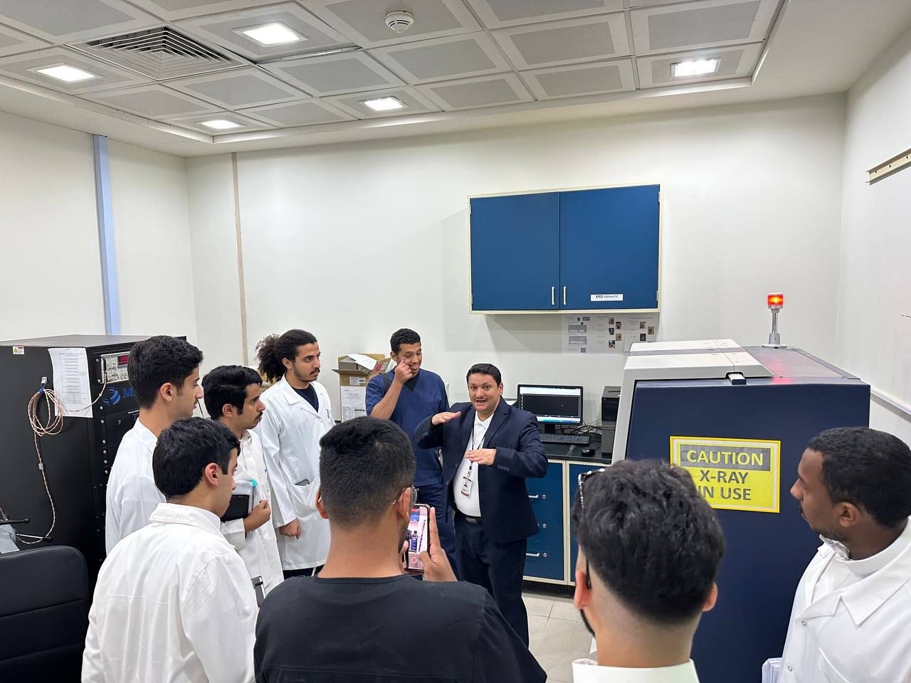 وبعد انتهاء الشرح توجه الطلاب والطالبات بعمل جولة داخل المختبر المركزي للتعرف على بعض الأجهزة المستخدمة في توصيف مركبات النانو مثل جهاز SEM وجهاز XRD.