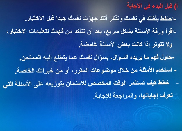 - تنمية قدراتهن على التخطيط الجيد للوقت والاستعداد للاختبار وكيفية التعامل مع الورقة الاختبارية .