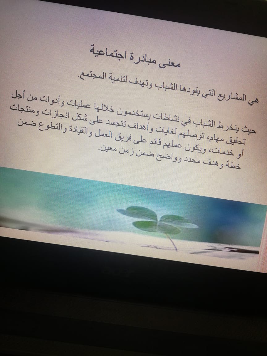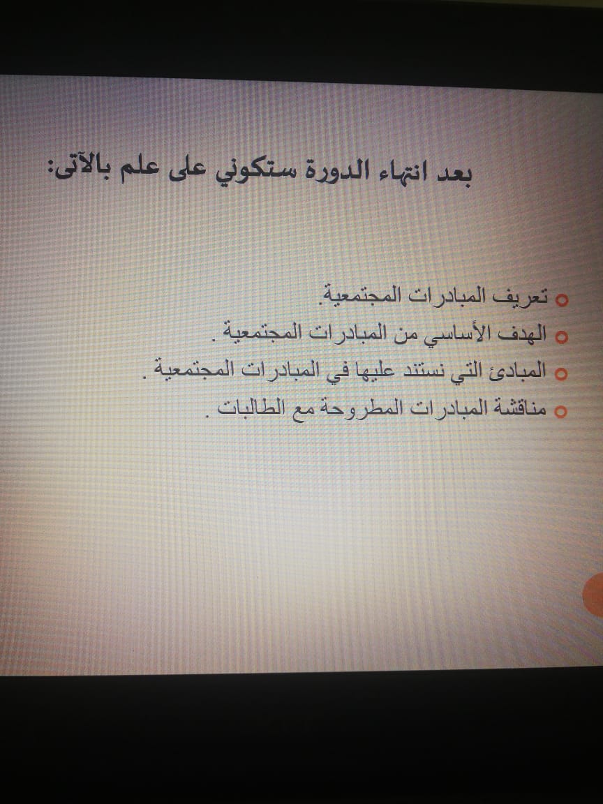 إكمالاً لمسيرة التميز بعمادة السنة التحضيرية شطر الطالبات وضمن فعاليات الملتقى العلمي الثالث, أقيمت دورة تدريبية بعنوان المبادرات المجتمعية ومن تقديم الأستاذة إلهام الشمري وذلك يوم الخميس الموافق1440/5/18هـ في قاعة التدريب والتخطيط , حيث استهلت الدورة التدريبية بعرض تقديمي يتضمن عدة محاور وهي: مفهوم المبادرات المجتمعية وأهدافها ومبادئ تنفيذ المبادرات وأثر هذه المبادرات خصوصا التطوعية منها على أفراد المجتمع. ومن ثم تم مناقشة المبادرات المشاركة في الملتقى لتعزيز ودعم الطالبات في مبادراتهن من خلال ذلك تم تبادل الأسئلة والاستفسارات من قبل الطالبات التي تسهم بالفائدة لمشاركاتهن في محور المبادرات التطوعية.