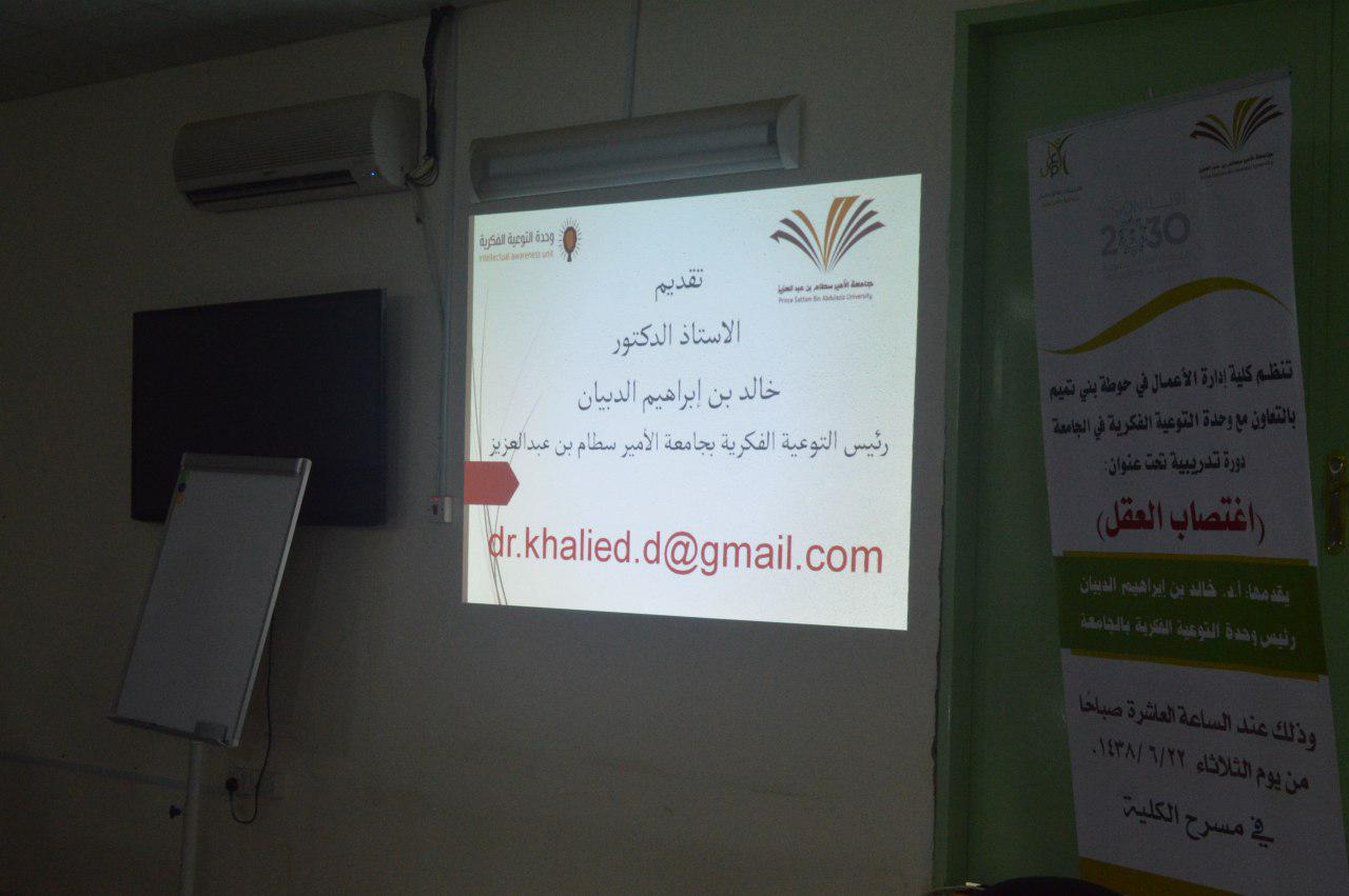 قدم رئيس وحدة التوعية الفكرية في الجامعة أ.د. خالد بن إبراهيم الدبيان دورة تدريبية تحت عنوان: (اغتصاب العقل)، لطلاب كلية إدارة الأعمال بحوطة بني تميم، في يوم الثلاثاء ١٤٣٨/٦/٢٢.