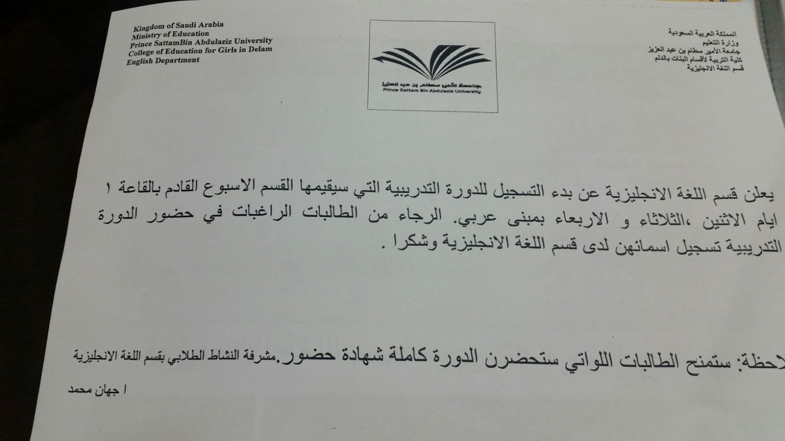 نظم قسم اللغة الانجليزية بالتعاون مع وحدة العمل الطلابي دورة تدريبية في اللغة الانجليزية لطالبات كلية التربية بالدلم تبدأ يوم الاثنين 1436/12/29هـ وتستمر لمدة ثلاثة أيام .