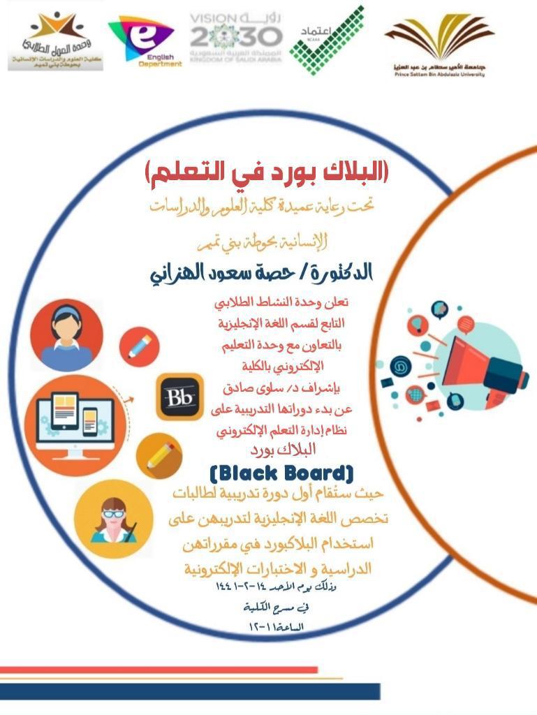 للتقنية دور مهم في العملية التعليمية، وحرصًا على توعية الطالبات وفي ظل قيادة عميدة كلية العلوم والدراسات الإنسانية د. حصة بنت سعود الهزاني. أقامت وحدة النشاط الطلابي التابع لقسم اللغة الإنجليزية بالتعاون مع وحدة التعليم الإلكتروني بالكلية بإشراف د. سلوى صادق دورتها التدريبية المخصصة لتعريف طالبات تخصص اللغة الإنجليزية عن الطريقة الصحيحة لاستخدام نظام إدارة التعلم الإلكتروني البلاك بورد (Black Board) في مقرراتهن الدراسية و الاختبارات الإلكترونية وذلك في يوم الأحد الموافق: 1441/2/14هـ الساعة الحادية عشرة صباحاً في مسرح الكلية، ومن أهم ما قُدّم في الدورة تدريب الطالبات على النواحي التالية: كيفية الوصول والدخول على نظام البلاك بورد - منطقة وجود الاختبارات الإلكترونية - الإرشادات التعليمية الخاصة بالاختبارات - كتابة كلمة المرور الخاصة بالاختبار - طُرق حل الأسئلة و كيفية التنقل بينها - أنواع الأسئلة وطريقة حل كل نوع - طريقة مراجعة الإجابات قبل تسليمها نهائيًا - حفظ الاختبار وإرساله بشكل نهائي. وقد لقيت الدورة اهتمامًا وإقبالًا من الطالبات.