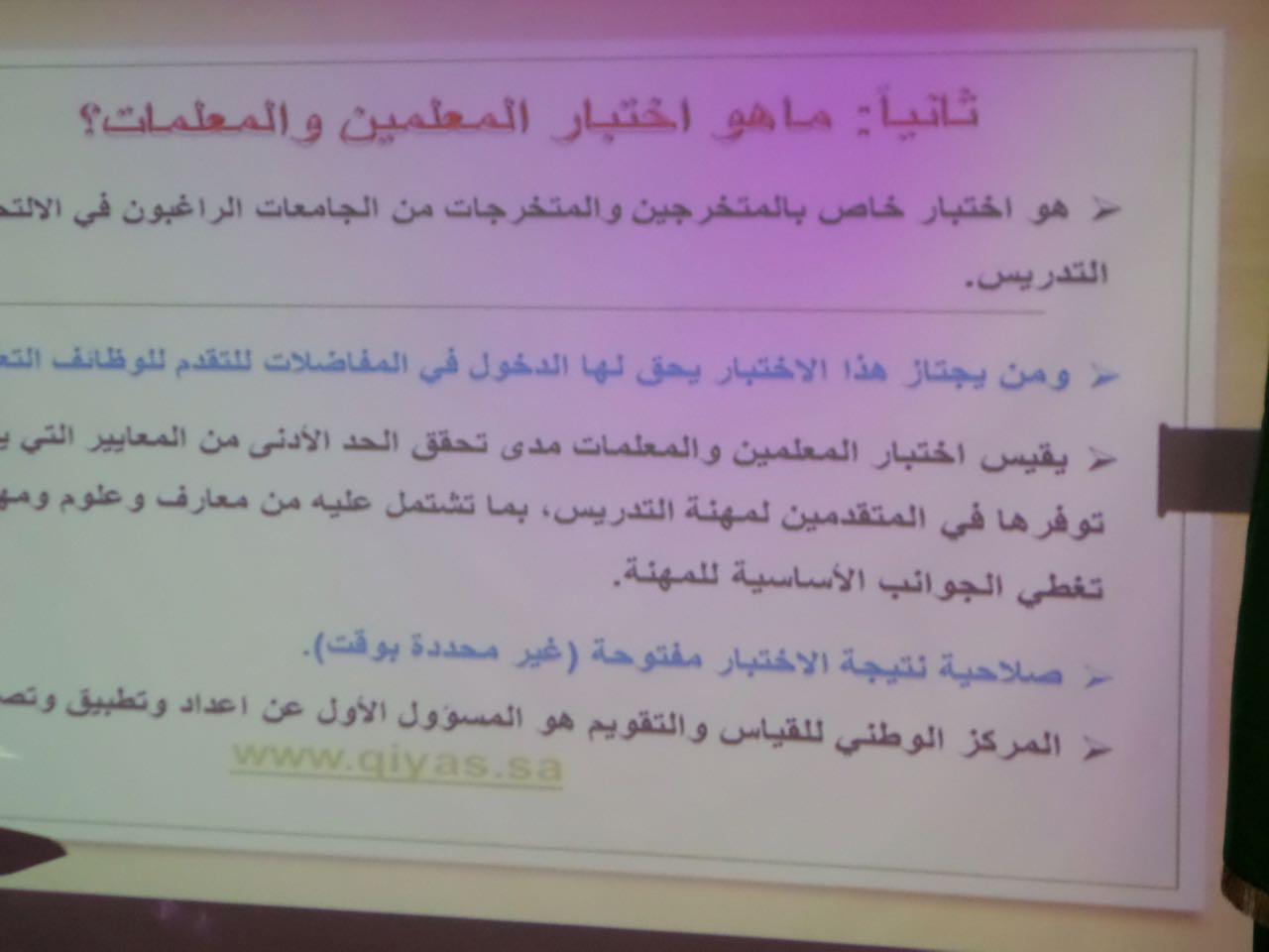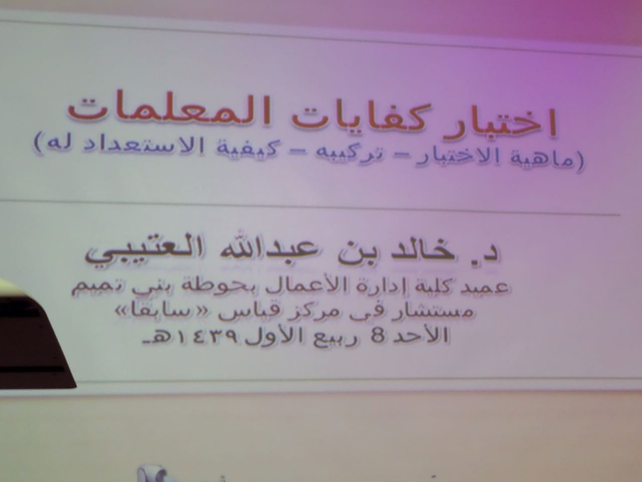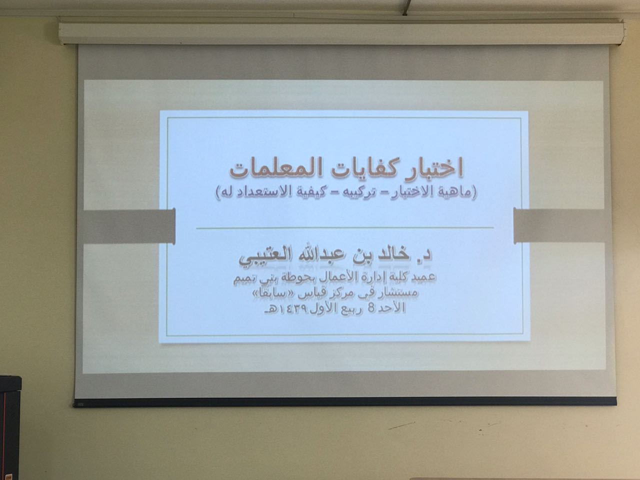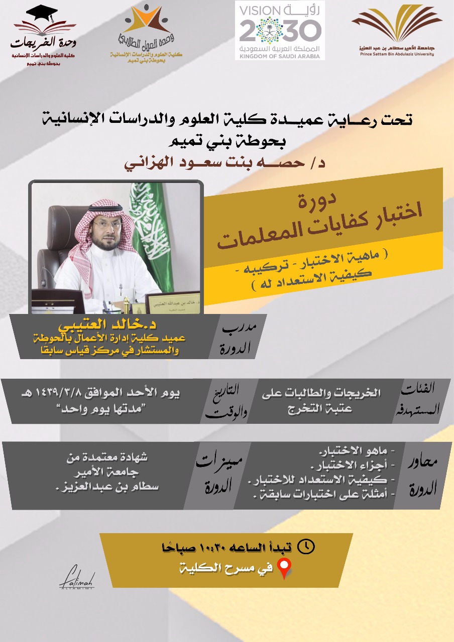 في إطار جهود وحدة الخريجات ولجنة التدريب والتأهيل في كلية العلوم والدراسات الإنسانية بحوطة بني تميم لتهيئة الخريجات لسوق العمل، تم انعقاد دورة عن ( إختبار كفايات المعلمات) يوم الأحد 8 / 3/ 1439 هـ .عُقدت الدورة عند الساعة العاشرة والنصف صباحاً في مسرح الكلية عن طريق الشبكة وتم استضافة الدكتور خالد العتيبي عميد كلية إدارة الأعمال في الحوطة والمستشار في مركز سابقاً. ناقش خلالها الدكتور خالد العتيبي عدة محاور متحدثاً عن الكفايات وأهمية الإختبار وأجزاء الإختبار وكيفية الإستعداد له جيداً. وفي الختام تم حل اسئلة بعض اﻻختبارات القديمة بمشاركة الطالبات وكان عدد الحضور اثنان وأربعون طالبة.