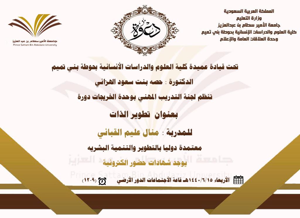 أقامت لجنة التطوير المهني بوحدة الخريجات في كلية العلوم والدراسات الإنسانية بحوطة بني تميم ورشة عمل بعنوان (تطوير الذات) للمدربة منال القباني يوم الاربعاء الموافق 15 / 6/ 1440 هـ بقاعة التدريب. هدفت الدورة الى تنمية الذات وتطوير السمات الشخصية للخريجات وذلك لإكساب الطالبات المهارات اللازمة للتوظيف واجتياز المقابلات الشخصية. تأتي هذه الدروة ضمن سلسة الدورات المقامة لدعم وتطوير الطالبات الخريجات واللاتي على وشك التخرج والتي تنفذ بشكل أسبوعي في قاعة التدريب الكلية.