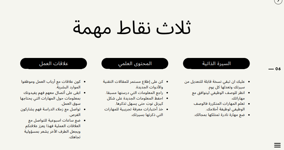 - ثلاث نقاط مهمة (السيرة الذاتية-المحتوى العلمي- علاقات العمل)