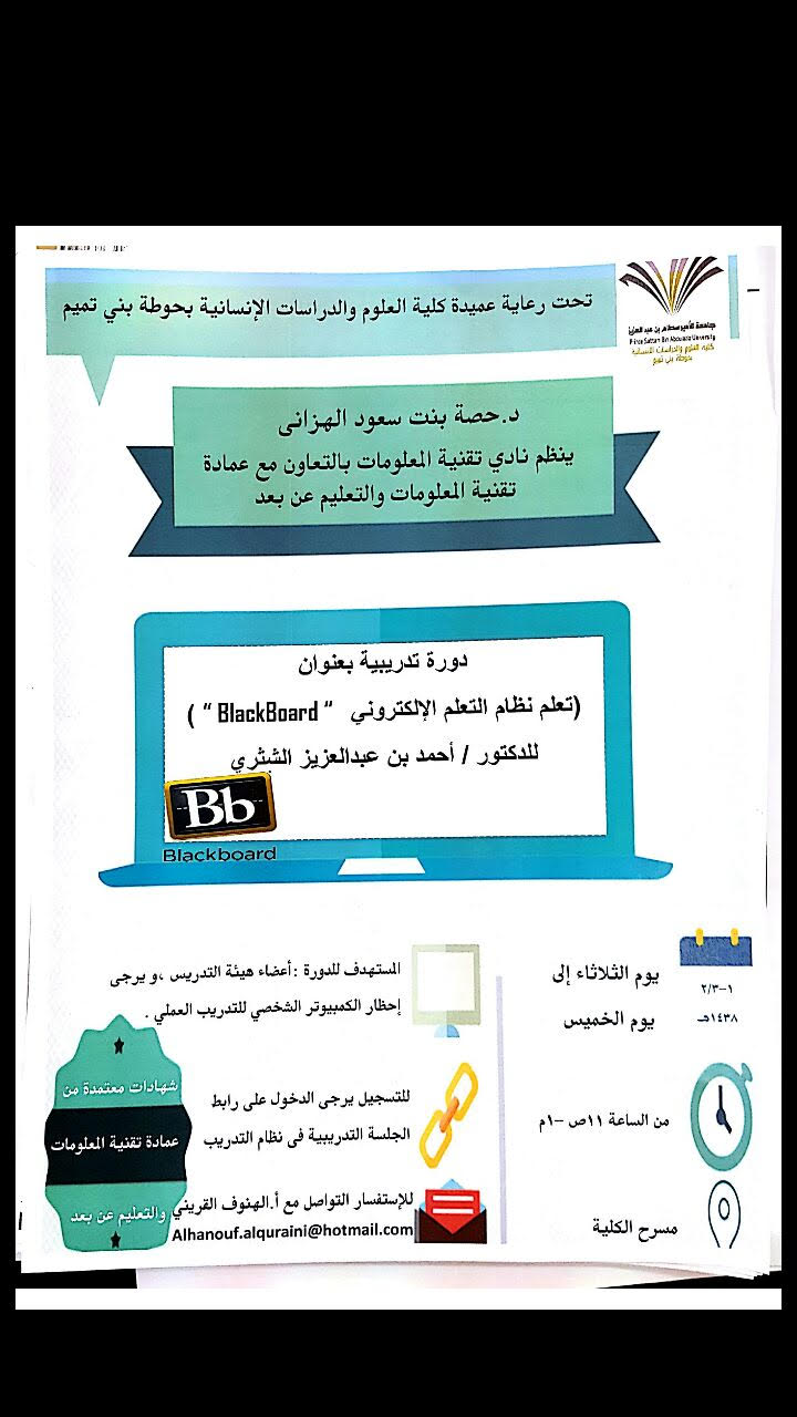 أقام نادي تقنية المعلومات بكلية العلوم والدراسات الإنسانية بحوطة بني تميم بالتعاون مع عمادة تقنية المعلومات والتعليم عن بعد بالجامعة دورة تدريبية بعنوان (تعلم نظام التعلم الإلكتروني “BlackBoard”) للمدرب المعتمد/ الدكتور أحمد بن عبدالعزيز الشثري لمدة ثلاثة أيام ابتداء من اليوم الثلاثاء الموافق 1 /2 /1438هـ المقامة في قاعة الاجتماعات بالدور الأرضي من الساعة الحادية عشر صباحًا وحتى الواحدة ظهرًا، والتي تهدف إلى تنمية معارف المشاركات لاستخدام طرق وتقنيات حديثة للعملية التعليمية وإكساب المعرفة لأعضاء هيئة التدريس بنظام البلاك البوورد لإثراء العملية التعليمية ببرامج حديثة تساعدهم في التواصل مع الطلبة بكفاءة عالية. وقد تضمنت الدورة لليوم الأول العديد من المحاور، منها: التعرف على بوابة التعلم الإلكتروني والأساسيات في التعامل مع النظام وكيفية إنشاء محاضرة لعدة أنواع من المحتوى مع شرح كل نوع بالتفصيل، بالإضافة إلى كيفية إنشاء مجلد يحتوي على العديد من محتوى المقرر.