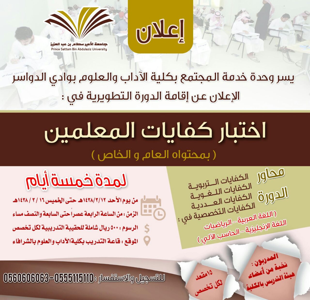 بتوجيه من عميد كلية الاداب والعلوم بوادي الدواسر د. سفر بن بخيت المدرع يسر وحدة خدمة المجتمع بالكلية اقامة دورة تطويرية لإختبار كفايات المعلمين بمحتواه الخاص والعام ولمدة خمس أيام ابتداء من يوم الاحد الموافق 1438/3/12هـ حتى يوم الخميس 1438/3/16هـ وبمعدل ثلاث ساعات ونصف يومياً بدءً من الساعة الرابعة عصر حتى الساعة السابعة والنصف مساءً وستكون هذه الدورة برسوم رمزية شاملة للحقيبية التدريبة لكل تخصص . ومحاور هذه الدورة : الكفايات التربوية - الكفايات اللغوية - الكفايات العددية - الكفايات التخصصية في كلا من :