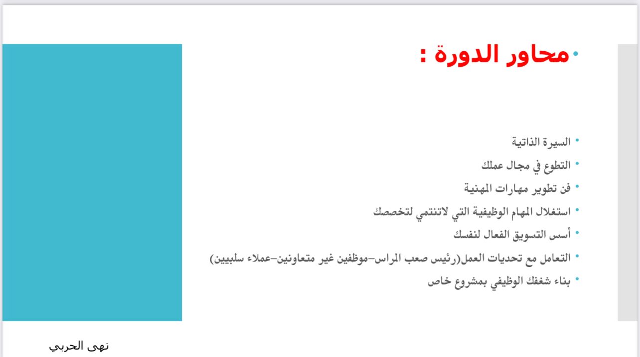 21/3/1443هـ عبر تطبيق زوم الأستاذة /نهى الحربي.وتهدف الدورة إلى رفع كفاءة الموظفات وتأهيل الباحثات عن فرص وظيفية لسوق العمل، وإكساب المشاركات مهارات الاتصال والتعامل الوظيفي، إضافة إلى تطوير الذات والنجاح في العمل، ومفاتيح التميز الوظيفي.. وتدور محاور الدورة التدريبية، حول تنمية الشخصية، والتعرف على الآخرين، وما هو العمل المناسب، وتعلم فنون المقابلة، ومواصفات السيرة الذاتية، إضافة إلى فن الحصول على وظيفة، وسلوكيات وأخلاق العمل.وتأتي مثل هذه الدورات تحقيقاً لأهداف الجامعة في رعاية الخريجات والاهتمام بالطالبة الجامعية بعد تخرجها من الجامعة .