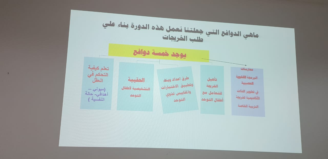 أقامت لجنة التاهيل المهني بوحدة خريجات كلية التربية بالخرج بالتعاون مع قسم التربية الخاصة يوم الثلاثاء الموافق 7/ 6/ 1440هـ, دورة بعنوان / (مهارات تطوير الذات الأكاديمية لخريجة التربية الخاصة),للدكتورة/ فايزة إبراهيم أحمد. وتهدف الدورة الى التعرف على استخدامات البرمجة اللغوية العصبية في تطوير الذات الأكاديمية لخريجة التربية الخاصة0وتعرفت المشاركات بالدورة على تعريف البرمجة اللغوية العصبية واستخداماتها ,مجالات تطبيق هذا العلم في مجال التربية الخاصة, استخدامات البرمجة اللغوية العصبية في تطوير الذات الأكاديمية لخريجة التربية الخاصة ,وفوائد علم البرمجة اللغوية العصبية للخريجة,والفرضيات المسبقة للبرمجة اللغوية العصبية وطرق استخدامها , وإطـــــــار الإدراك مع الأطفال ذوي الاحتياجات الخاصة.وبنهاية الدورة تدربت المشاركات على تمارين لزيادة كفاءة عمل المخ ,وتدريبات عملية على الخطوات الست للبرمجة اللغوية NLP,وتأهيل الخريجة للتعامل مع أطفال التوحد,وأهم التغيرات التي طرأت على فئة اضطراب التوحد وفقا للمعايير الجديدة للدليل ((Dsm.وحضرت الدورة تقريباً 30 خريجة.