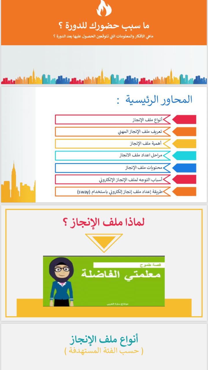 تمحور اللقاء حول عدد من النقاط الهامة تمثلت في الآتي ،، إنشاء بريد في الجيميل و انشاء ملفات في القوقل درايف و تحميلها و انشاء ملف مهني الكتروني باستخدام google sites و تعديل وتنسيق ملف الانجاز المهني و كيفية نشر ملف الانجاز لذوي العلاقة و كيفية انشاء الاستبانات الالكترونية والاختبارات الالكترونية في نهاية البرنامج التدريبي استطاعت المشاركات انشاء ملفات انجاز مهنية ،،،".