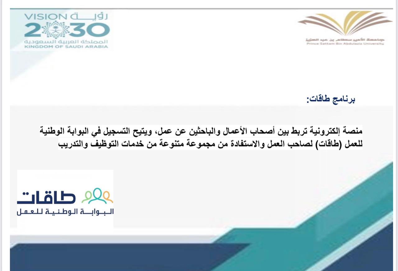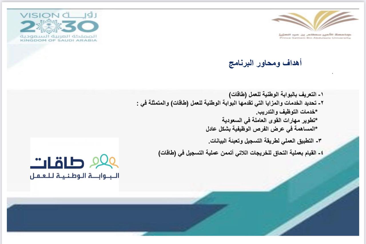 الوطنية للعمل " طاقات" ودور مزودي الخدمة في اعتماد الطلب . وحضر الدورة مجموعة كبيرة من اللخريجات والطالبات المتوقع تخرجهن بنهاية الفصل الدراسي الثاني للعام الجامعى 1442هـ.