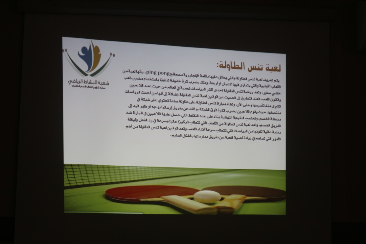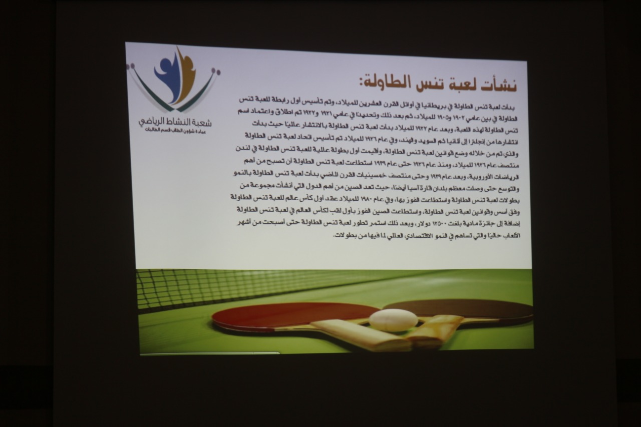 قامت وحدة العمل الطلابي ممثلة في البرامج الرياضية بكليات الأفلاج (قسم الطالبات) يوم الأثنين الموافق 1441/7/7هـ الساعة العاشرة صباحاً في القاعة الرياضية بانطلاقه دوري تنس الطاولة، ويهدف إلى توعية الطالبات بأهمية الرياضة والألعاب الرياضية، و التعريف بلعبة تنس الطاولة ونشأتها وقوانينها وفوائدها.