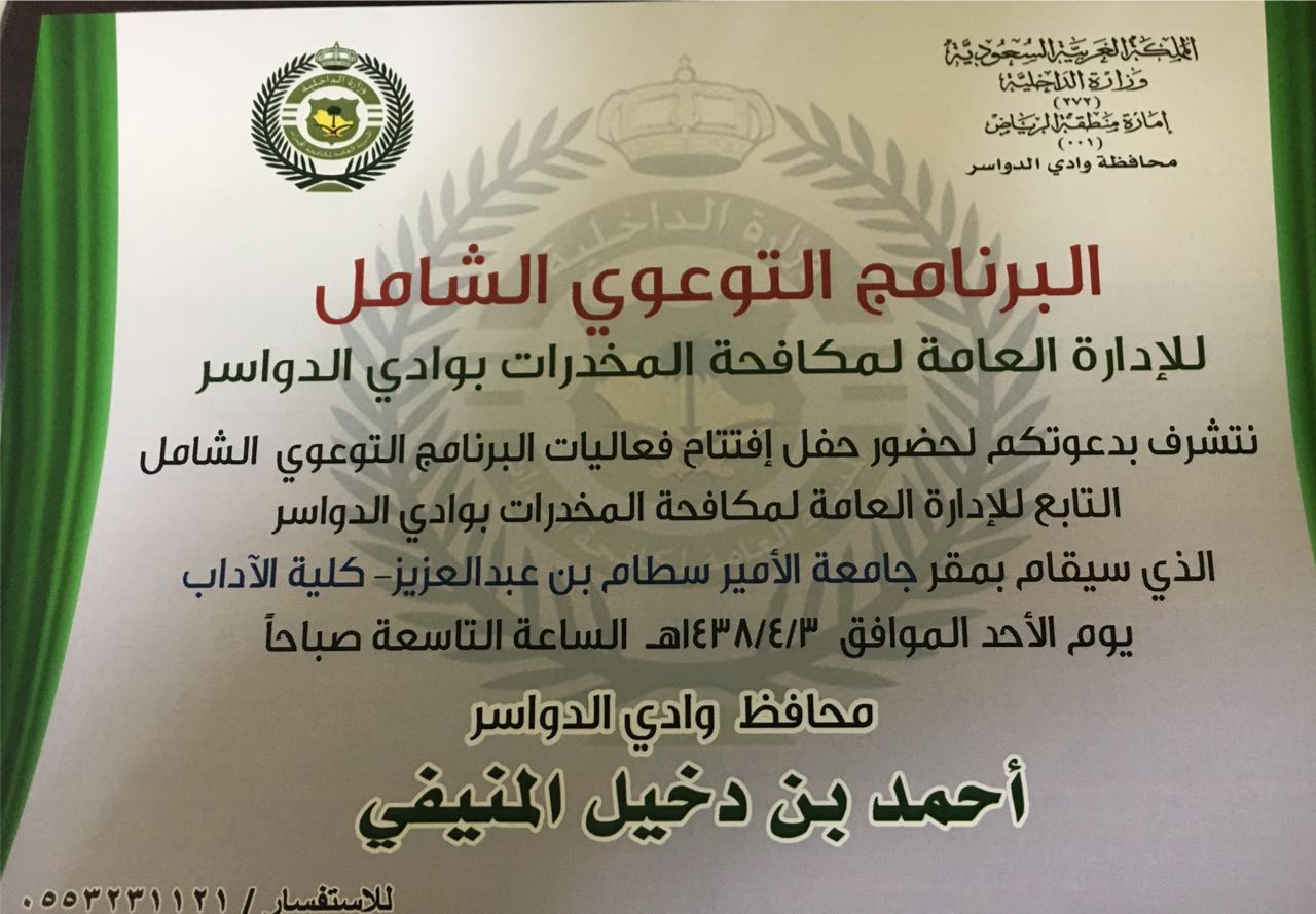 يسر وكالة الجامعة للفروع أن تدعوكم لحضور حفل البرنامج التوعوي الشامل للإدارة العامة لمكافحة المخدرات بوادي الدواسر والذي سيقام يوم الأحد الموافق ١٤٣٨/٤/٣ في تمام الساعة التاسعة صباحاً بمسرح كلية الاداب والعلوم والذي تنفذه كلية التربية بالتعاون مع مديرية إدارة مكافحة المخدرات بالمحافظة
