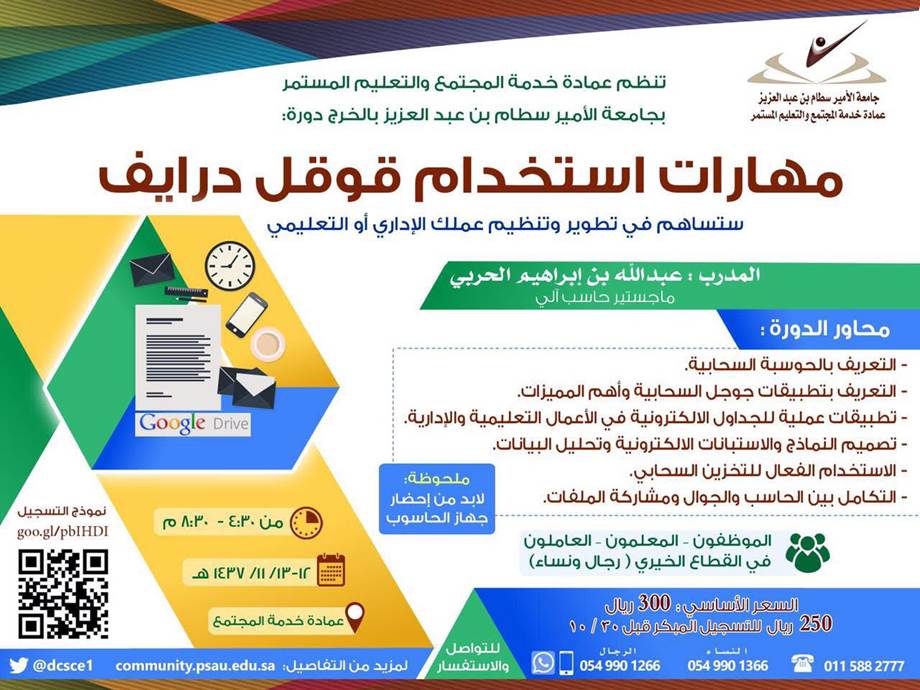 تعلن عمادة خدمة المجتمع والتعليم المستمر بجامعة الأمير سطام بن عبدالعزيز بالخرج عن بدء التسجيل في البرنامج التدريبي ( مهارات استخدام قوقل درايف ) يقدمها المدرب: أ. عبدالله بن إبراهيم الحربي ، لمدة يومين ابتداء من يوم الاثنين: 12/ 11/ 1437
