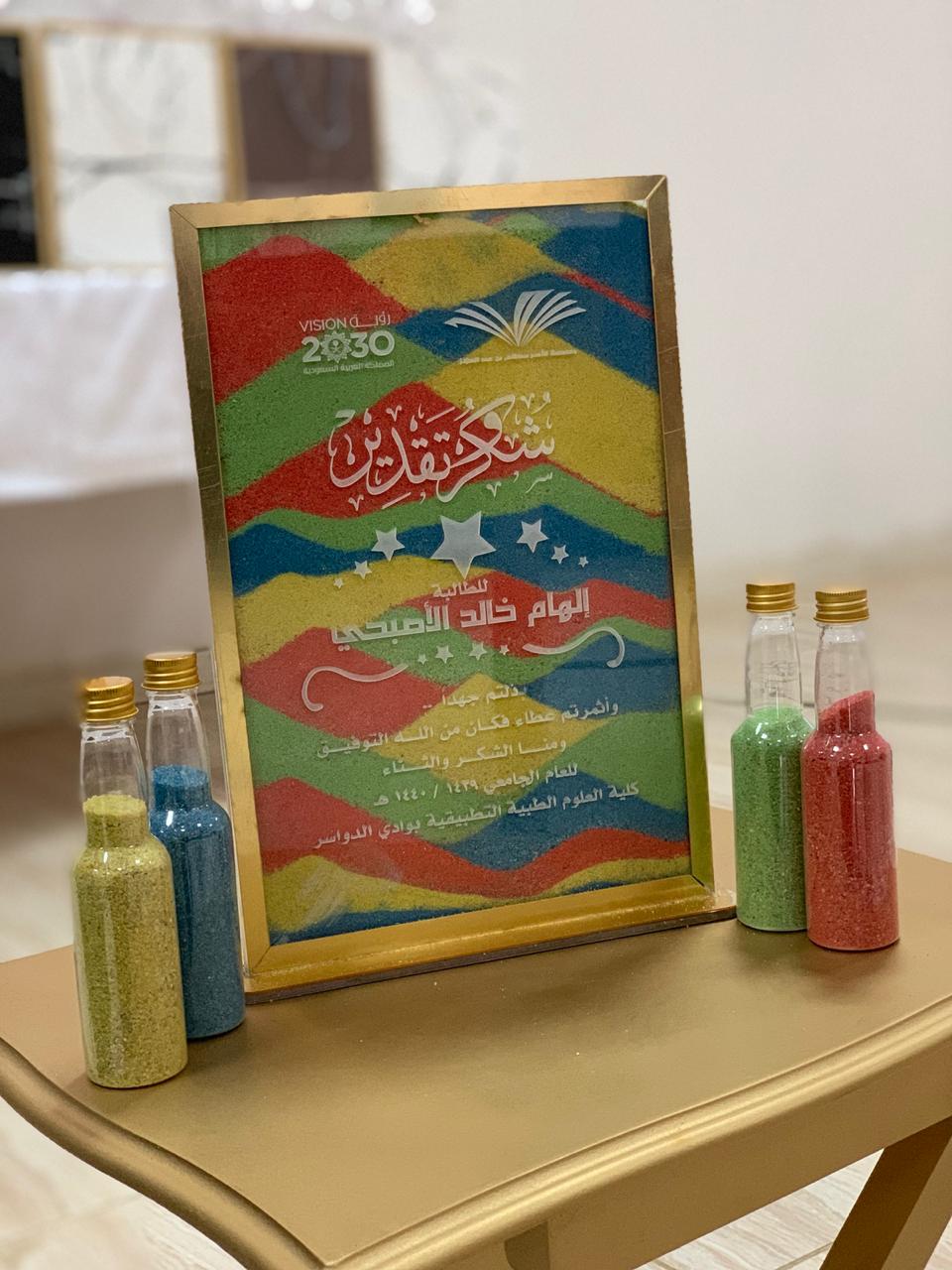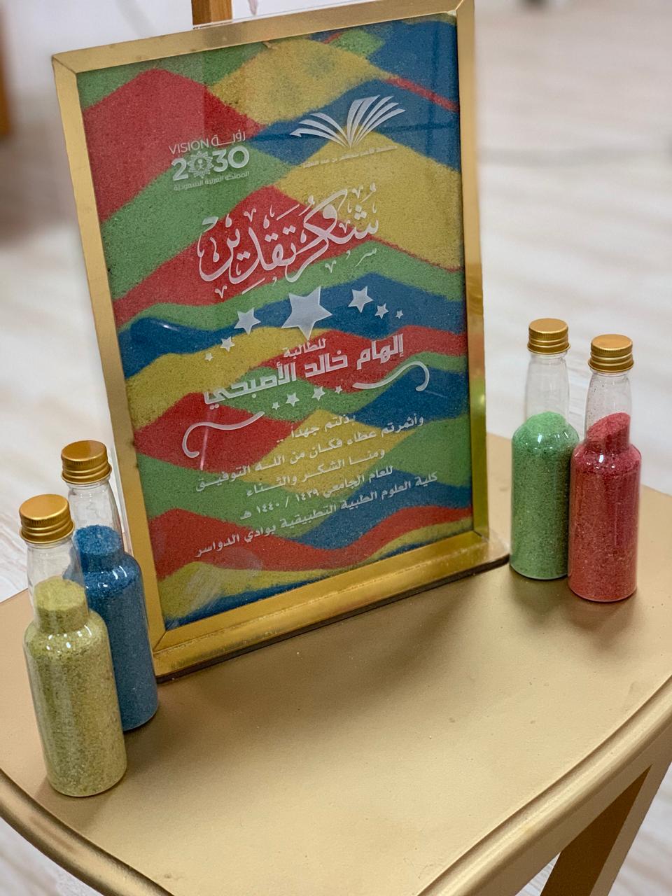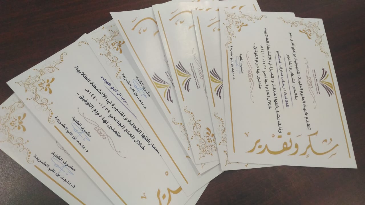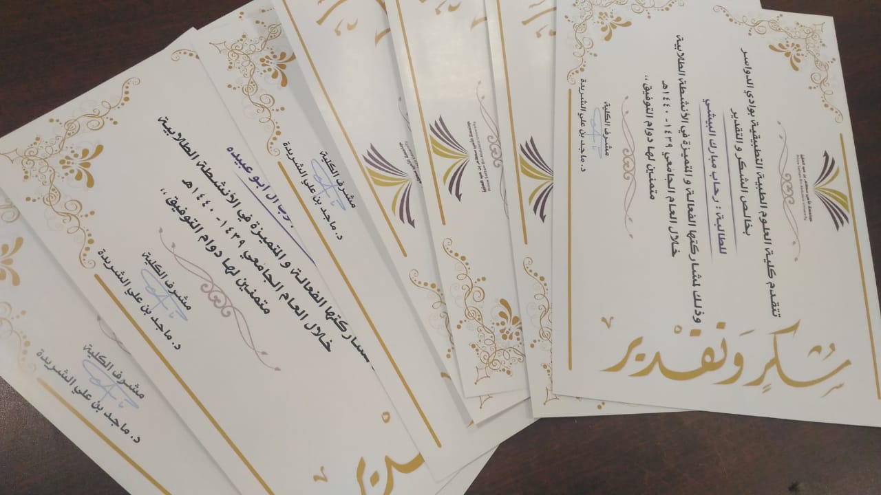 تحت رعاية المشرف على كلية العلوم الطبية التطبيقية بوادى الدواسر سعادة الدكتور ماجد على الشريدة أقامت الكلية يوم الخميس الموافق٦/٨ / ١٤٤٠ھ الحفل الختامى للأنشطة الطلابية حيث بدأ الإحتفال بآيات من القرآن الكريم ثم قامت منسقة وحدة العمل الطلابى د/هيام أحمد محمد بشكر جميع العاملين بالوحدة من المجلس الطلابى والأندية المختلفة والمشاركات بالملتقى العلمى والأنشطة الإجتماعية والثقافية المختلفة على مدار العام الدراسى ثم قامت مساعدة العميد للشؤون الأكاديمية والتعليمية بشكر جميع الأعضاء والطالبات على ما بذلوه من جهود عظيمة كان لها أثرها البارز فى الإرتقاء بجميع أعمال وفعاليات الأنشطة الطلابية وأكدت على أهمية الأنشطة ودورها فى تنمية مهارات وقدرات الطالبات كما شكرت منسوبات الكلية والجهاز الإدارى الذى ساهم فى إنجاح الأنشطة ثم أختتم اليوم بتكريم طالبات المجلس الطلابى والطالبات الاتى شاركن فى الفعاليات والأنشطة المختلفة على مدار العام الدراسى متمنيين لهن التوفيق والنجاح لرفعة مجتمعهن.