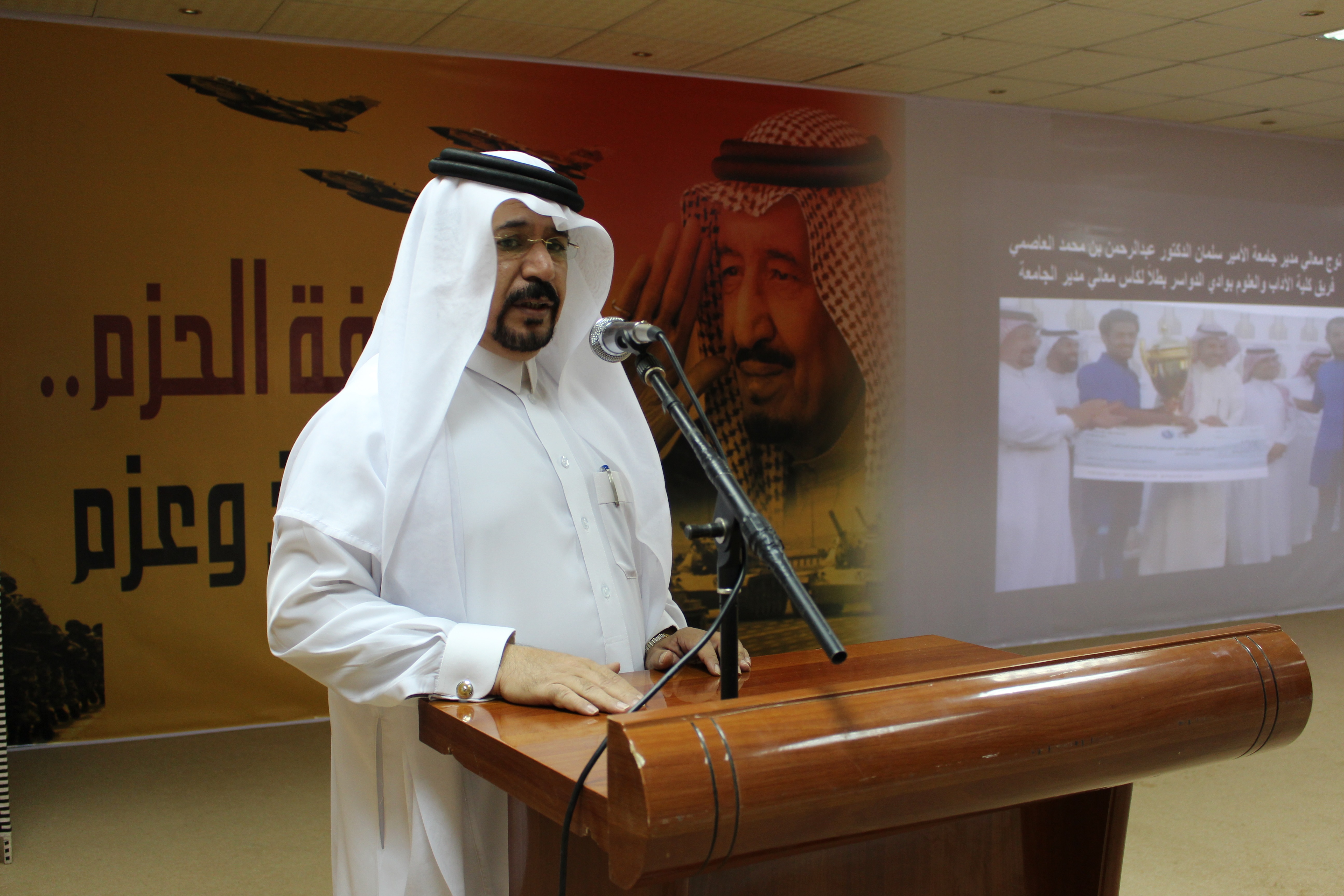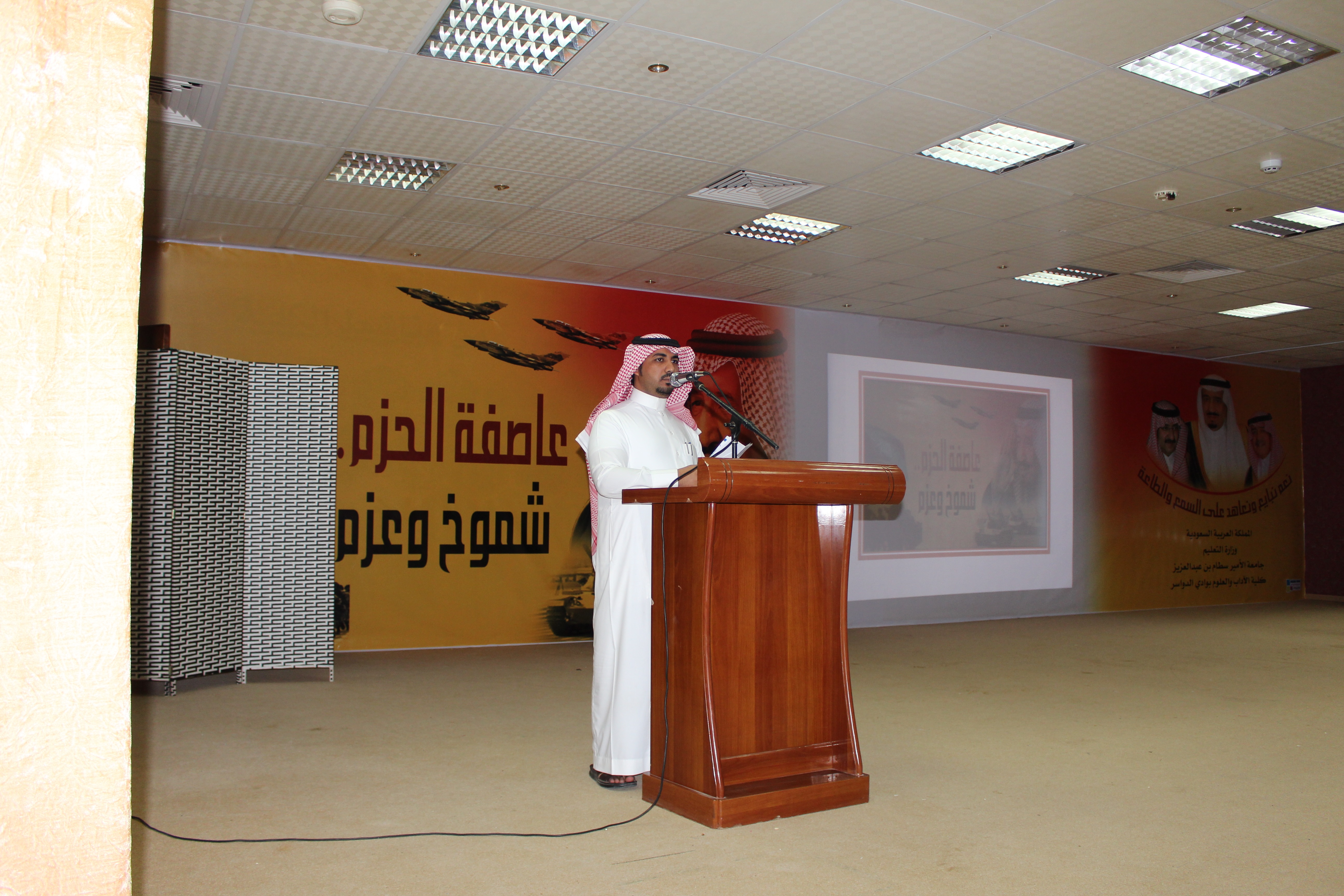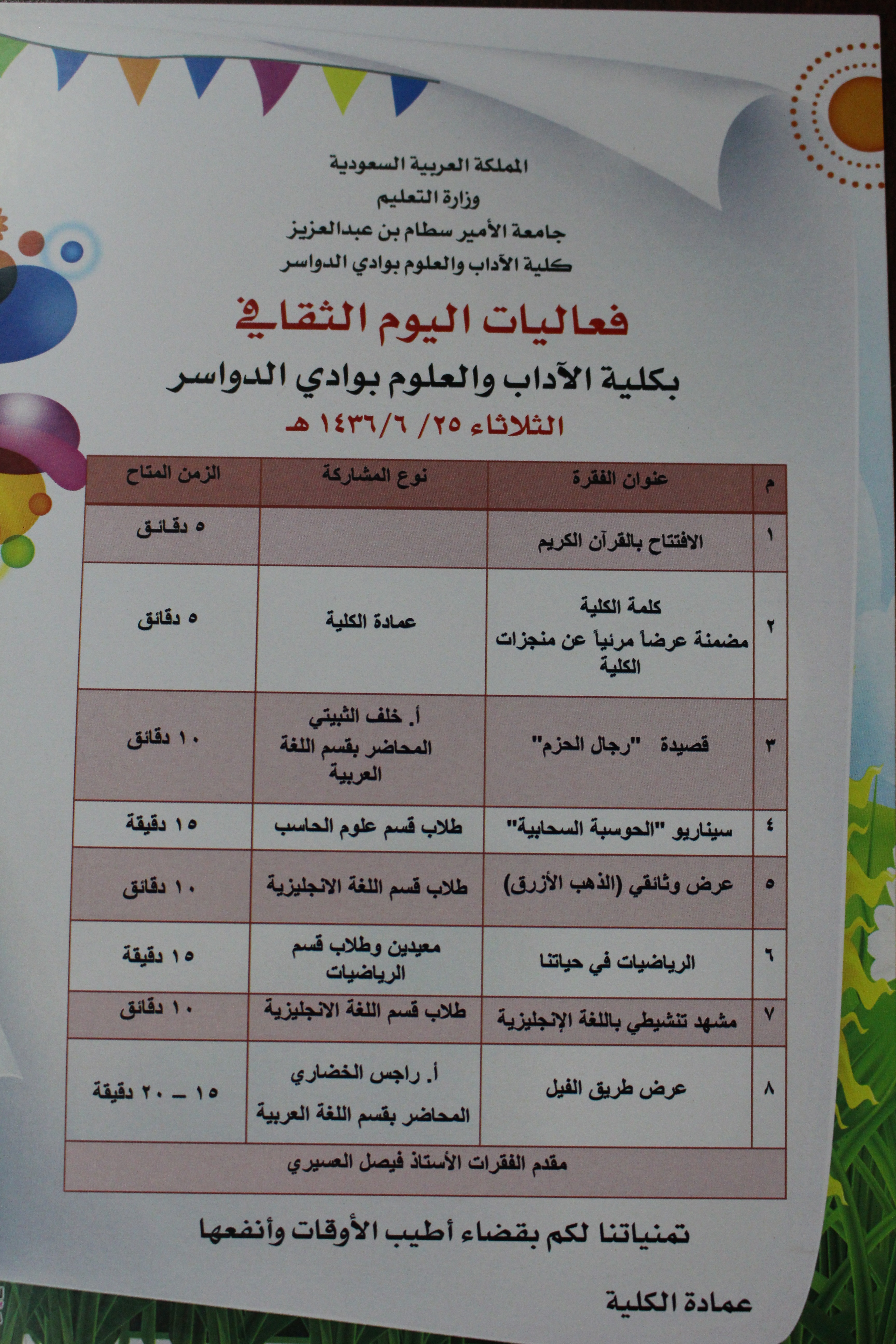 أقامت كلية الآداب والعلوم بمحافظة وادي الدواسر فعاليات اليوم الثقافي تحت رعاية وكيل الجامعة للفروع الدكتور مبارك بن محمد الحماد بحضور عميد الكلية الدكتور ناصر بن محمد المهيزع ووكيل الكلية الدكتور عبدالله بن محمد ال تميم وعدد من مديري الدوائر الحكومية وأعضاء المجلس المحلي بالمحافظة وأعضاء هيئة التدريس والموظفين والطلاب وقد بدأت الفعاليات بتلاوة آيات من القرآن الكريم، ومن ثم ألقى الدكتور ناصر المهيزع عميد الكلية كلمة الكلية تضمنت عرضا مرئيا عن منجزات الكلية، تلاها قصيدة وطنية بعنوان رجال الحزم جاءت معبرة عن موقف العزة والكرامة الذي انتهجته المملكة في إغاثة الشعب اليمني ونصرته ألقاها الأستاذ خلف الثبيتي المحاضر بقسم اللغة العربية، ثم توالت فقرات الحفل لإقسام الكلية :