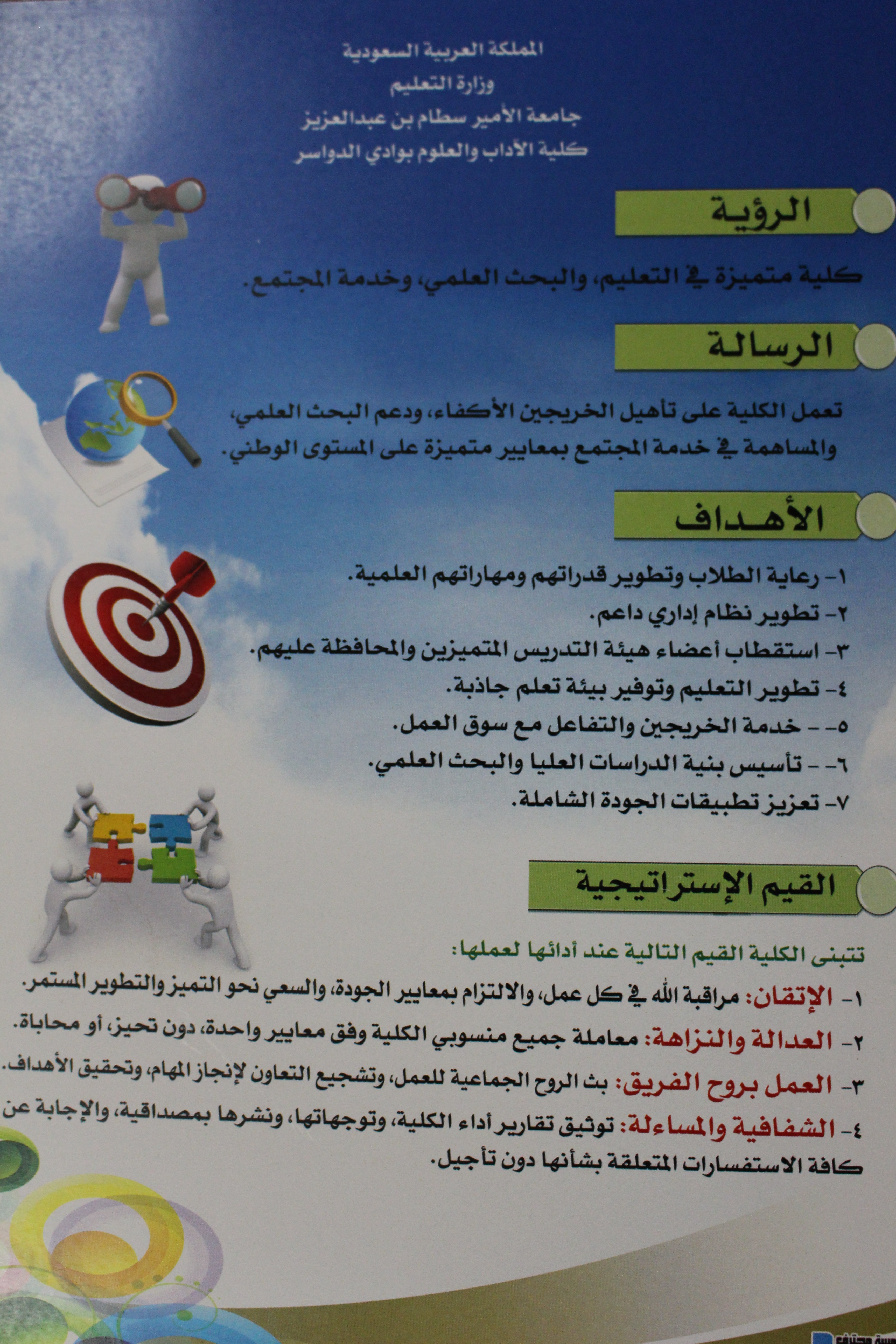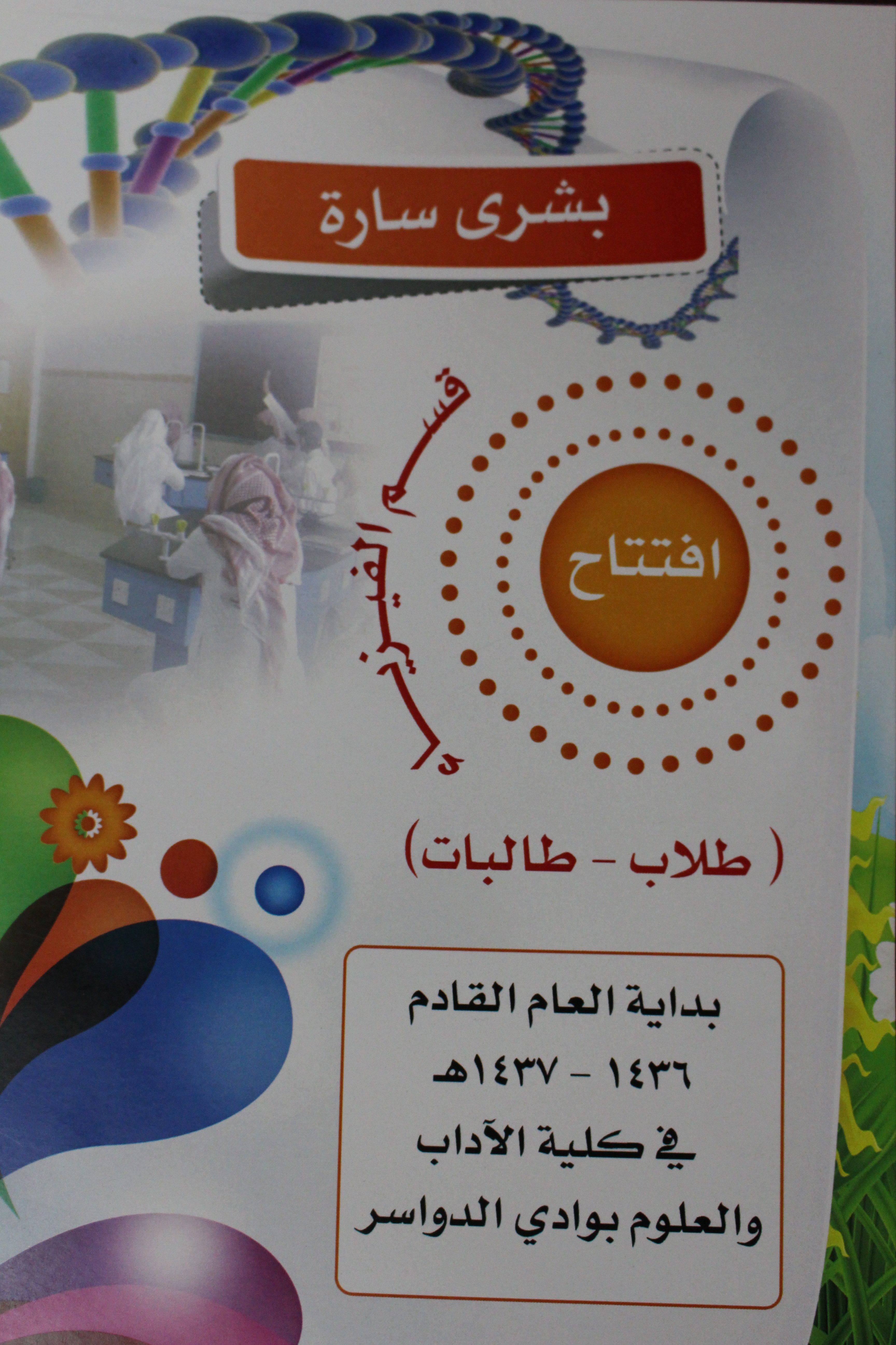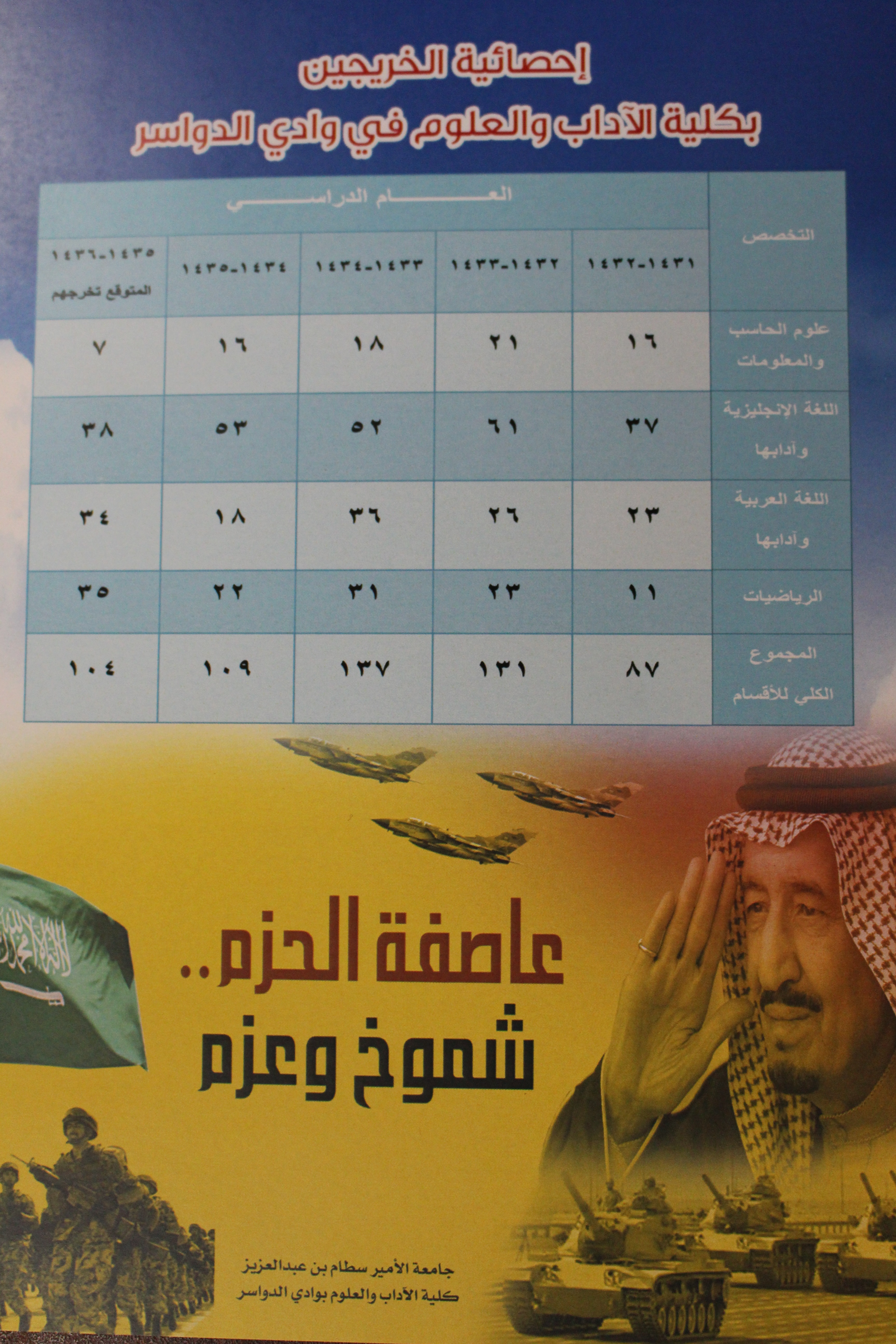 أقامت كلية الآداب والعلوم بمحافظة وادي الدواسر فعاليات اليوم الثقافي تحت رعاية وكيل الجامعة للفروع الدكتور مبارك بن محمد الحماد بحضور عميد الكلية الدكتور ناصر بن محمد المهيزع ووكيل الكلية الدكتور عبدالله بن محمد ال تميم وعدد من مديري الدوائر الحكومية وأعضاء المجلس المحلي بالمحافظة وأعضاء هيئة التدريس والموظفين والطلاب وقد بدأت الفعاليات بتلاوة آيات من القرآن الكريم، ومن ثم ألقى الدكتور ناصر المهيزع عميد الكلية كلمة الكلية تضمنت عرضا مرئيا عن منجزات الكلية، تلاها قصيدة وطنية بعنوان رجال الحزم جاءت معبرة عن موقف العزة والكرامة الذي انتهجته المملكة في إغاثة الشعب اليمني ونصرته ألقاها الأستاذ خلف الثبيتي المحاضر بقسم اللغة العربية، ثم توالت فقرات الحفل لإقسام الكلية :