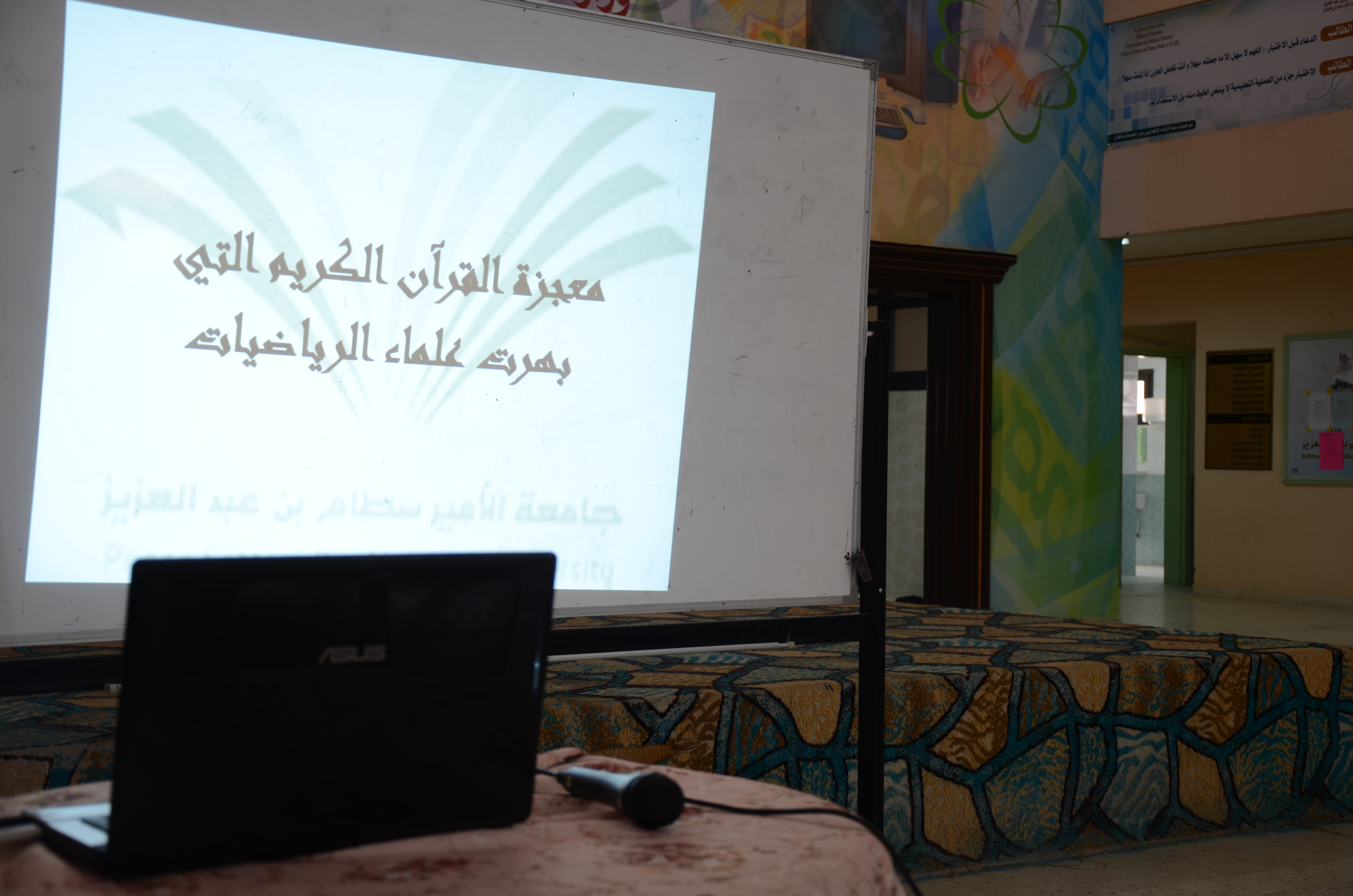 وفي يوم الإثنين الموافق 20/7/1438هـ قدمت طالبات القسم برنامج ( الرياضيات في القرآن الكريم ) تحت إشراف الدكتورة / إبتسام محجوب والذي يهدف إلى ربط العلوم الدنيوية بالقرآن الكريم ، وأهمية الرياضيات في حساب المواريث والزكاة وتدبر وتأمل القرآن وما فيه من معجزات توصل إليها العلم الحديث .