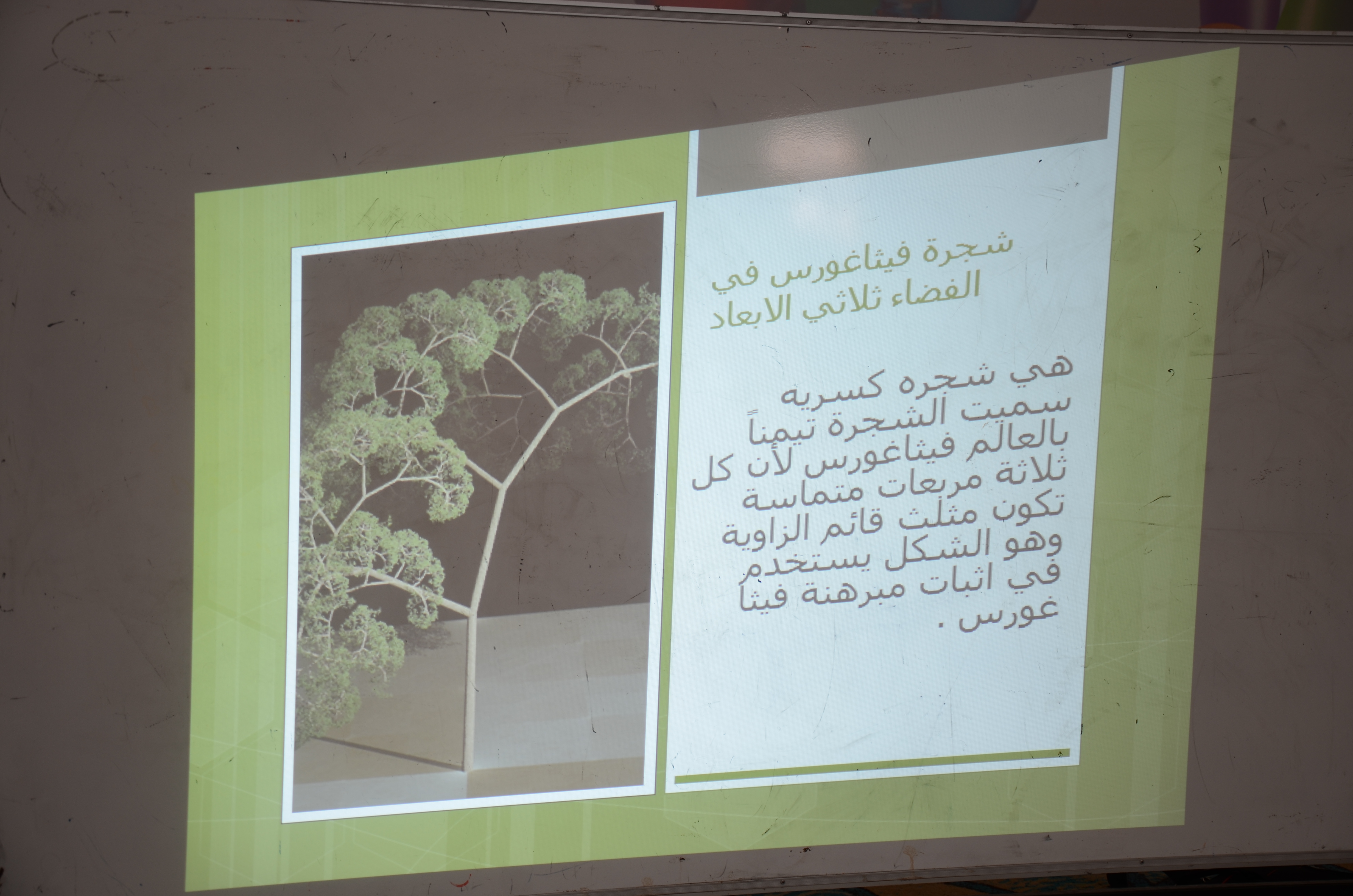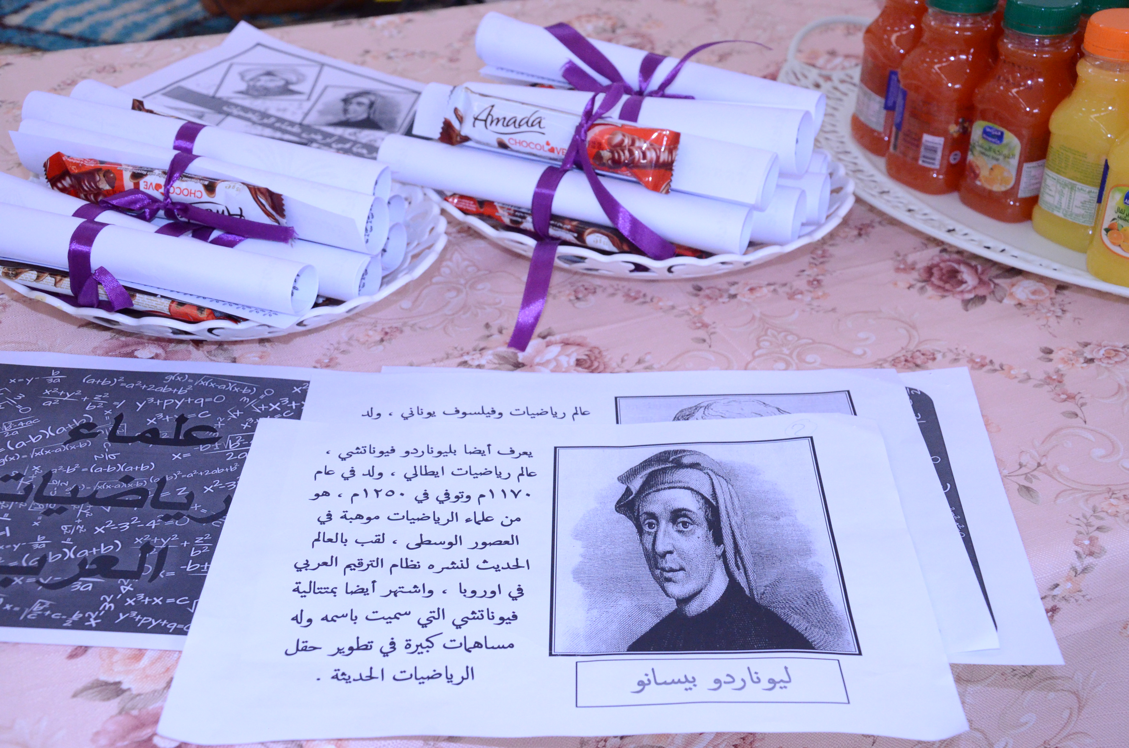 وفي اليوم التالي قدمت طالبات القسم تحت إشراف الدكتورة / أميره محمد , برنامج ( علماء الرياضيات ) والذي يهدف إلى تعريف الطالبات بدور علماء الرياضيات ومدى إسهامهم في تطور الرياضيات عبر العصور .